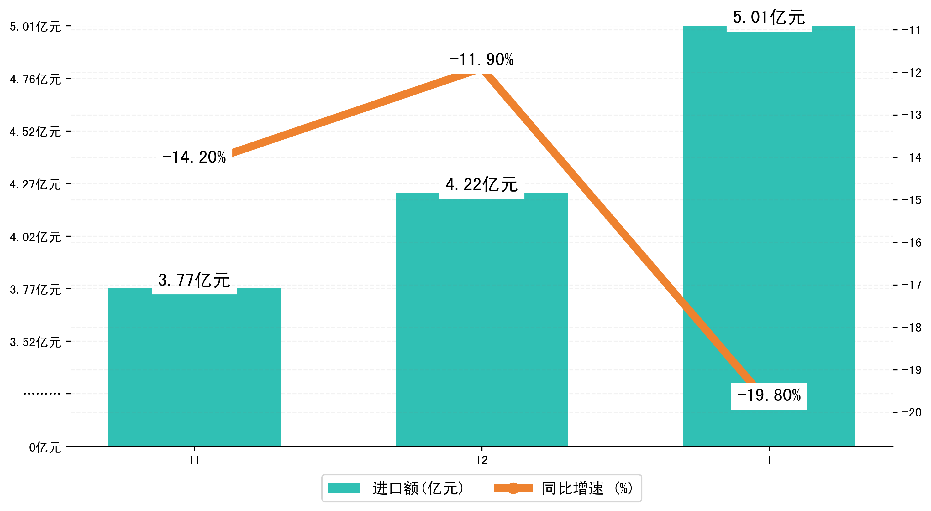 以人民币计,2025年1-1月蚌埠市进口额为5,0128.3121万元,相比上年同期减少了1,2357.9824万元,同比减少了-19.80%。