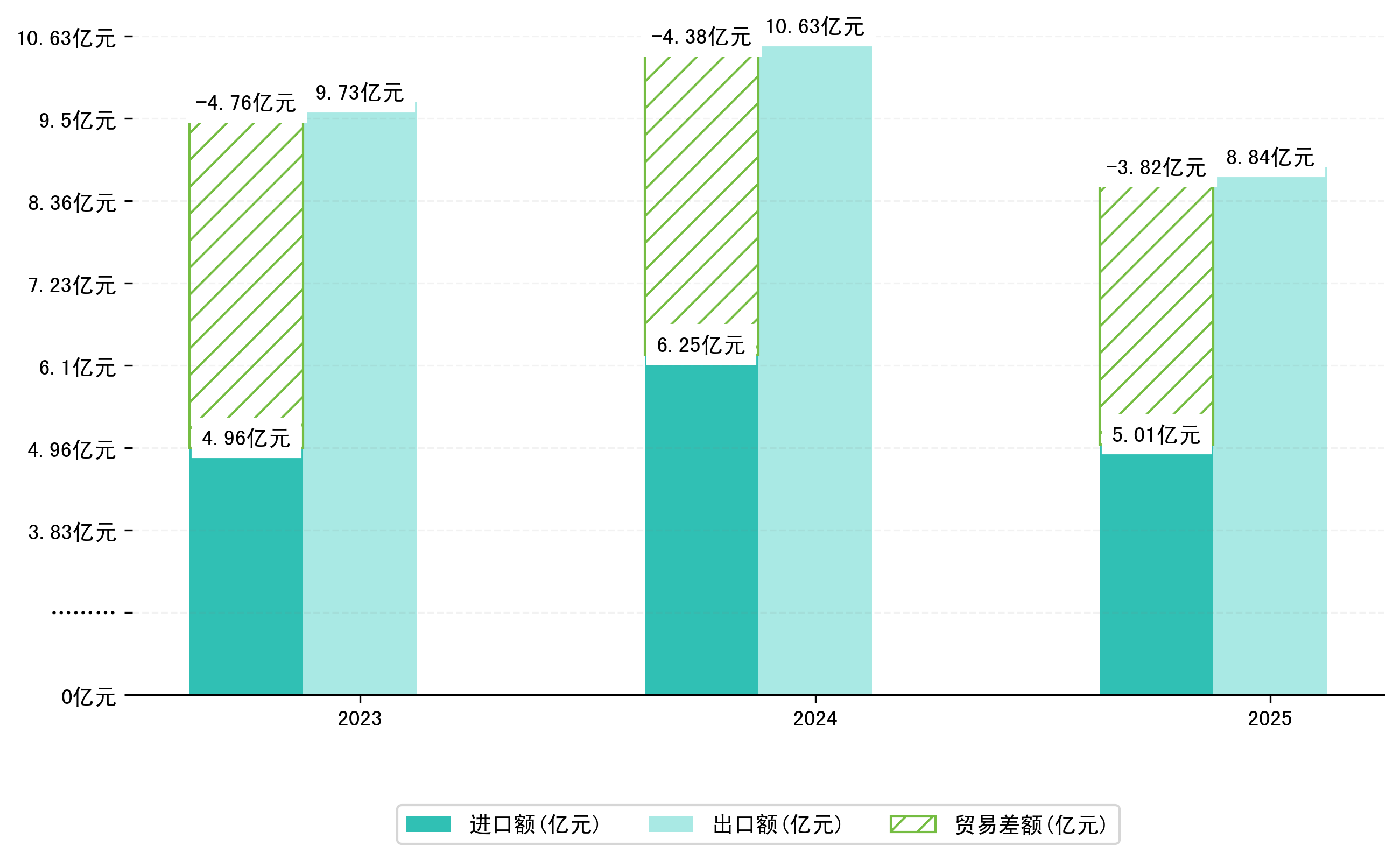 以人民币计,2025年1月蚌埠市贸易差额为3,8237,7202万元(贸易顺差),相比上月减少了5631,0654万元,即812,7369万美元;相比上年同期减少了5610,6913万元,同比减少-12.8%。