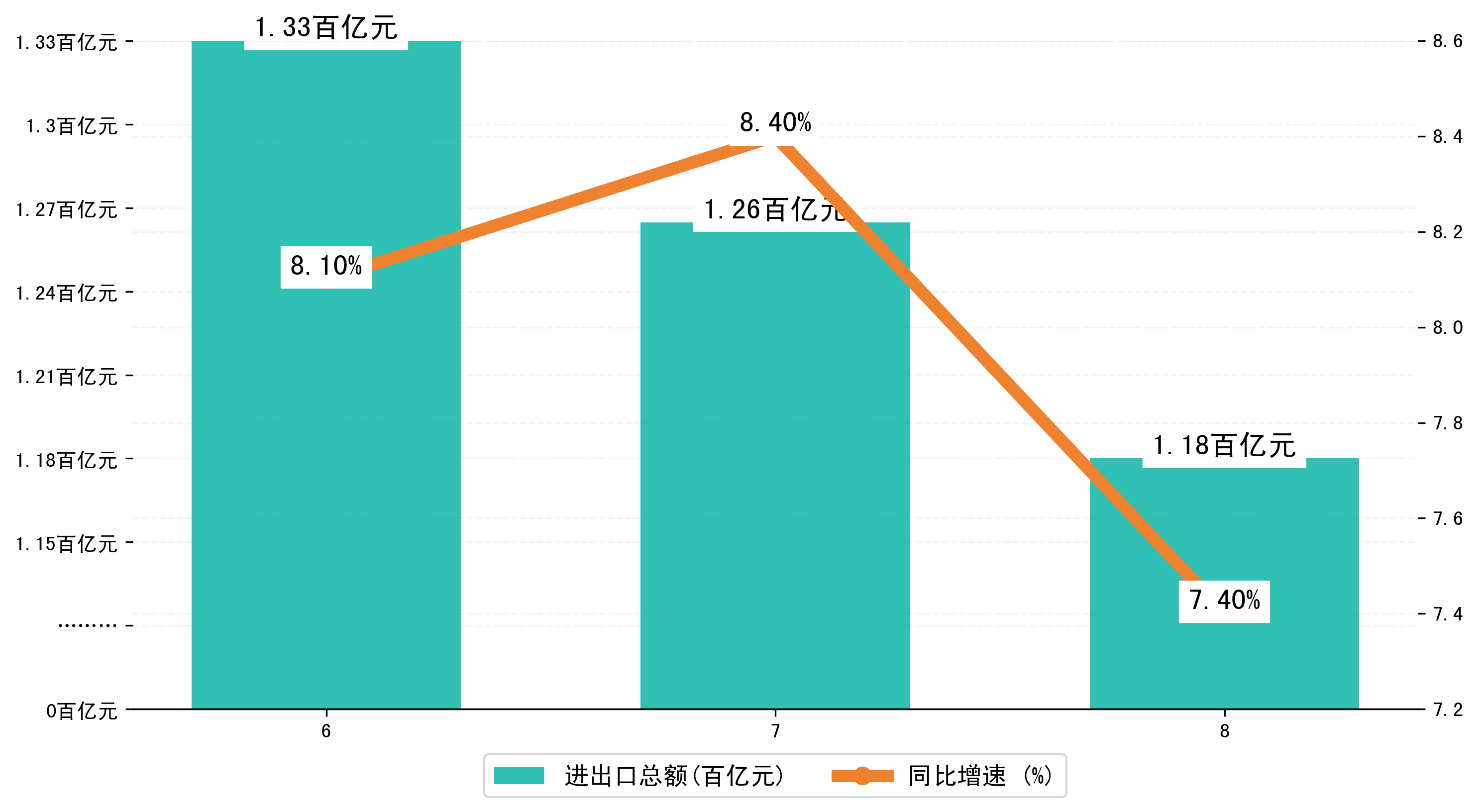 以人民币计,2025年1-8月石家庄市进出口总额为914,5919.5793万元,相比上年同期增加了56,7089.5953万元,同比增加了7.40%。