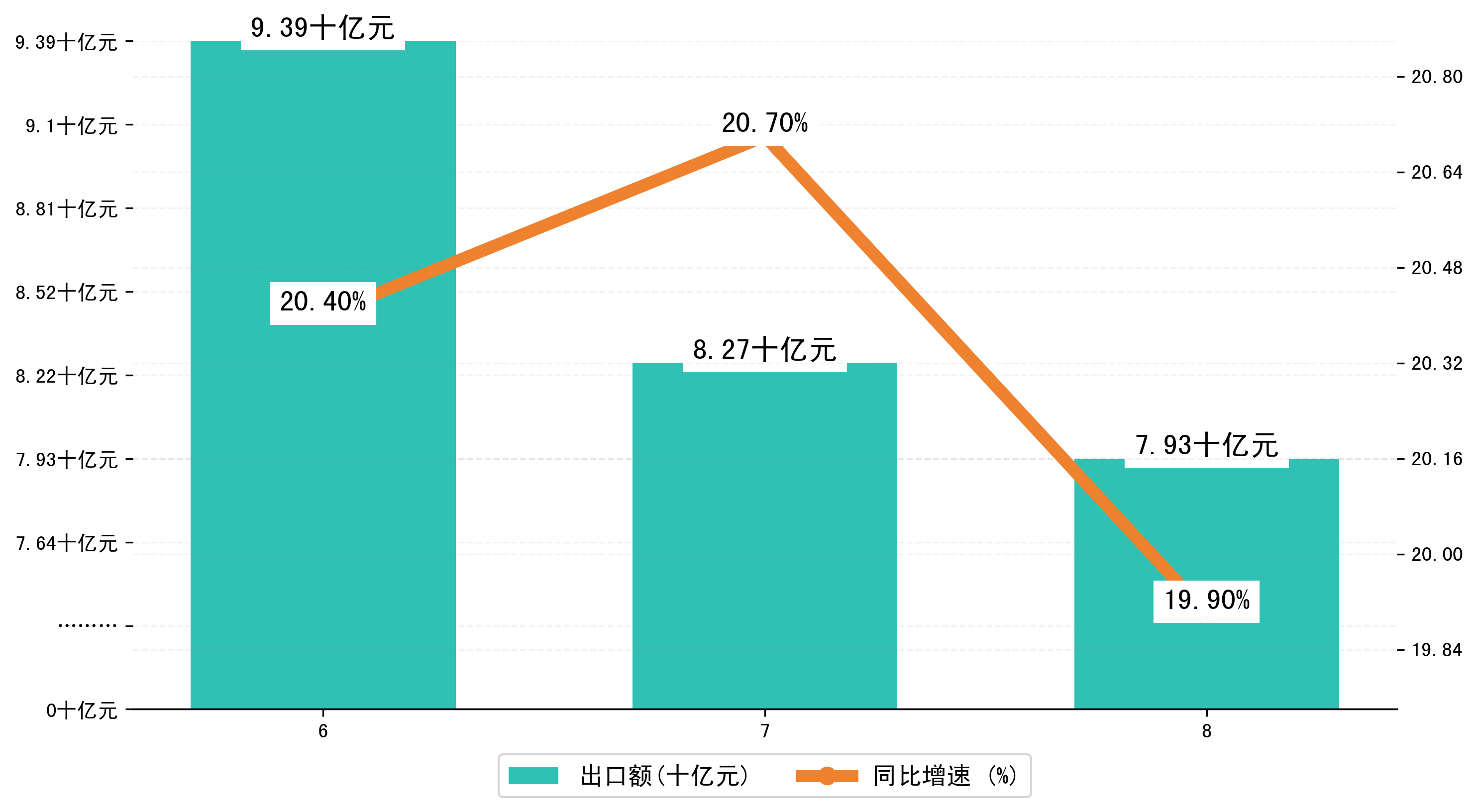 以人民币计,2025年8月石家庄市出口额为79,3188.5102万元,相比上月减少了3,3528.7397万元;相比上年同期增加了10,2770.9329万元,同比增加了19.90%。