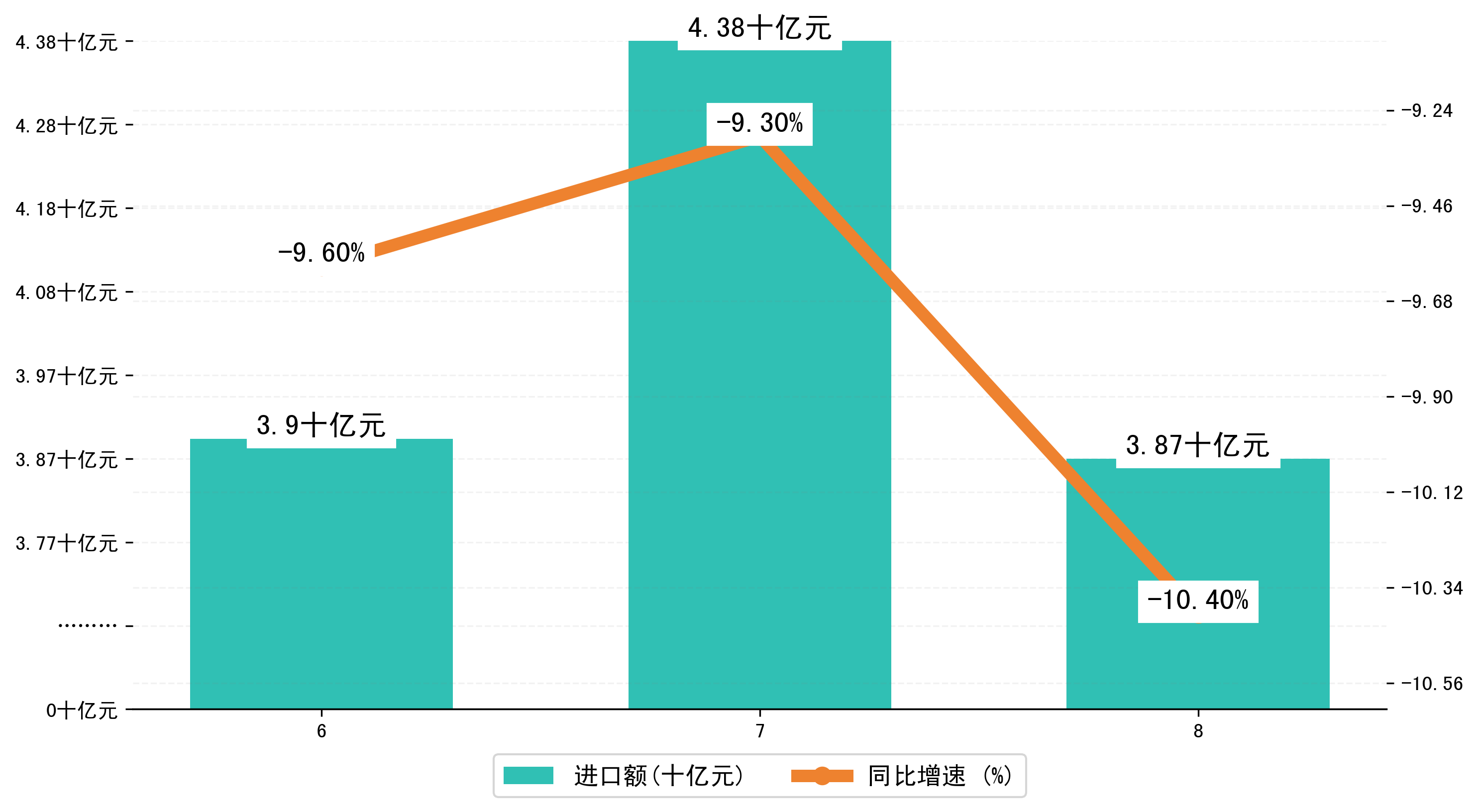 以人民币计,2025年8月石家庄市进口额为38,7428.1849万元,相比上月减少了5,0278.4182万元;相比上年同期减少了10,0220.7235万元,同比减少了-10.40%。
