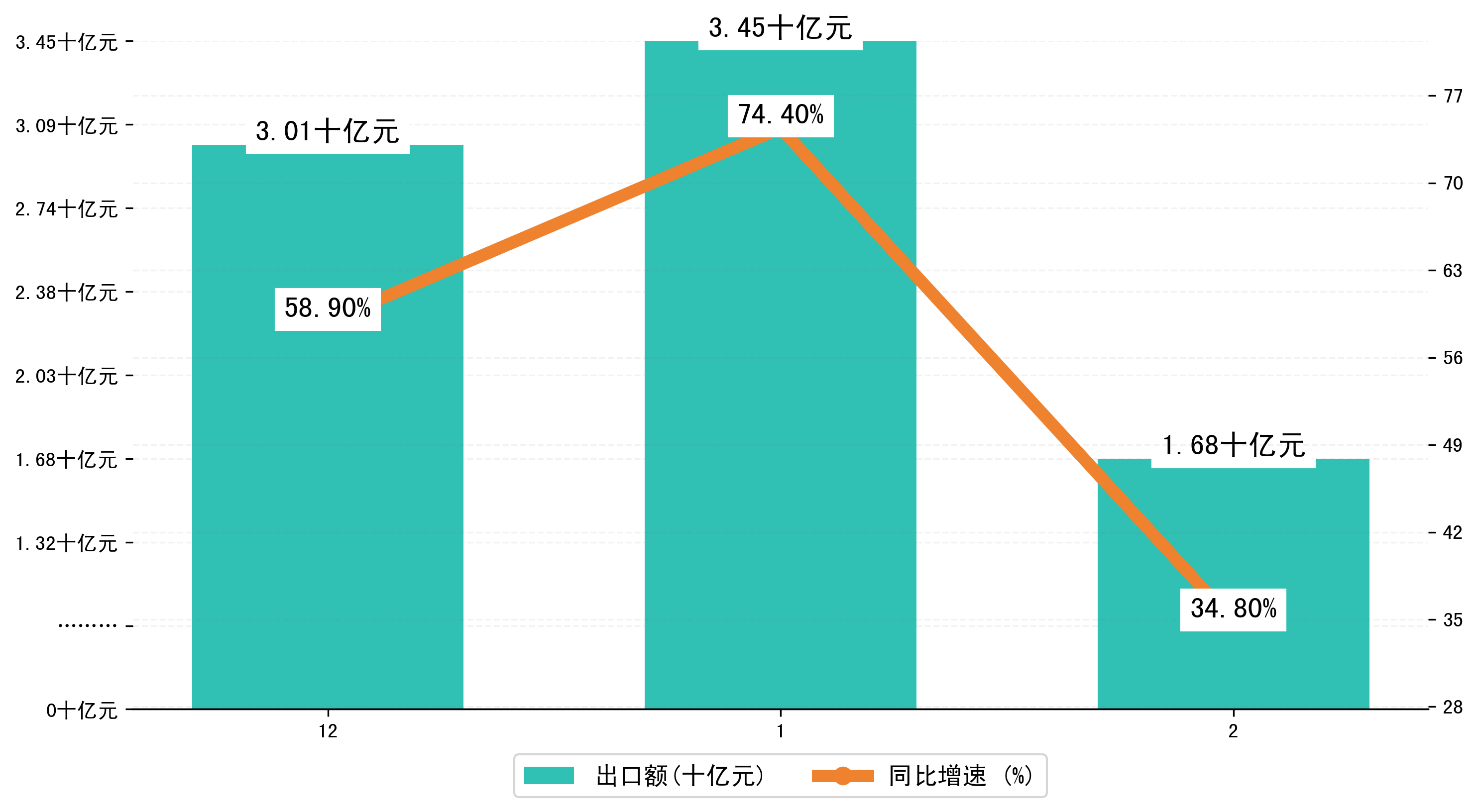 以人民币计,2024年1-2月长春市出口额为51,2365.5432万元,相比上年同期增加了13,2518.4395万元,同比增加了34.80%。