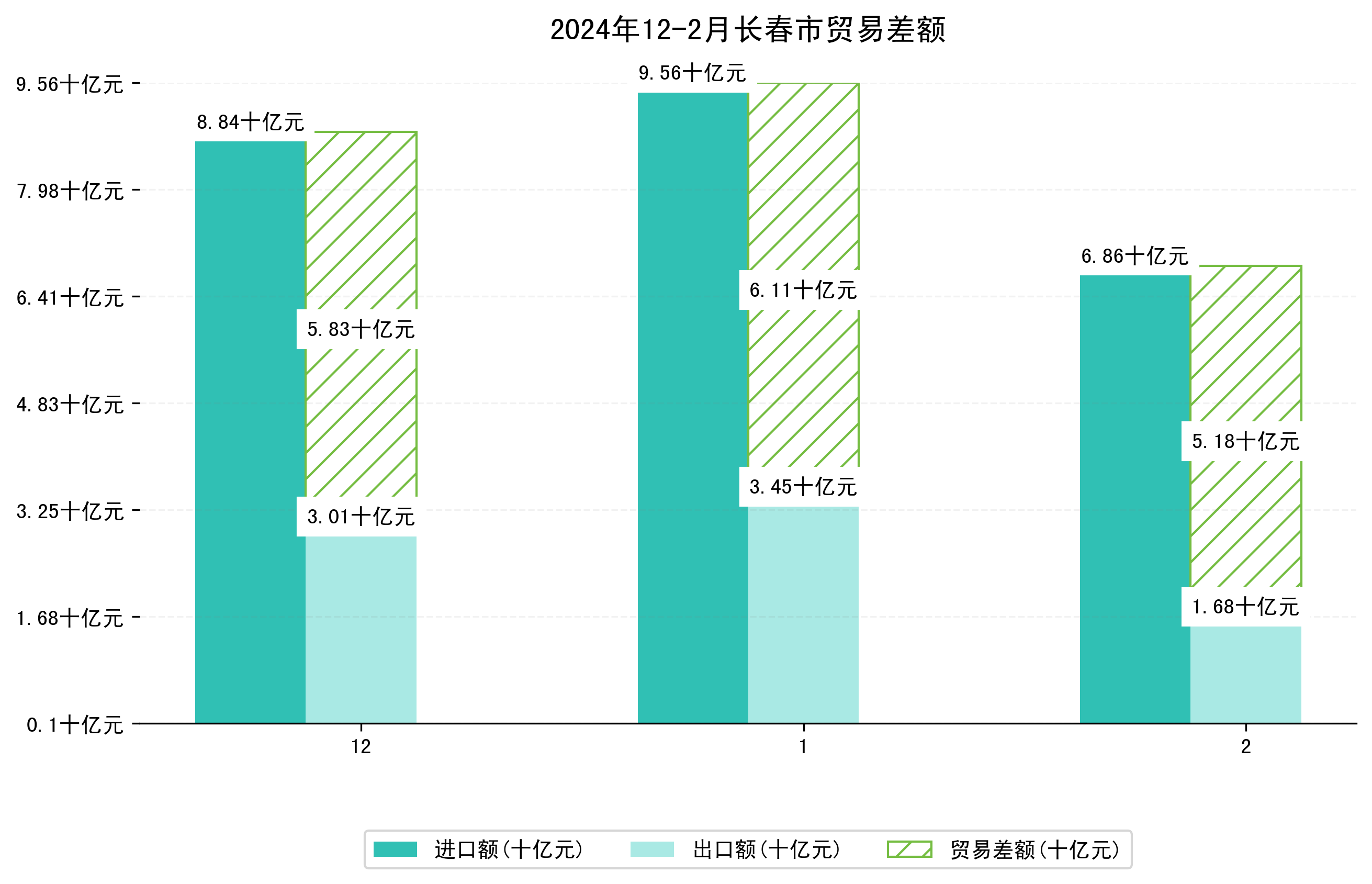 以人民币计,2024年2月长春市贸易差额为51,8442,9044万元(贸易逆差),相比上月增加了9,2604,5347万元,即1,2991,3463万美元;相比上年同期增加了6,0588,7909万元,同比增加-10.46%。