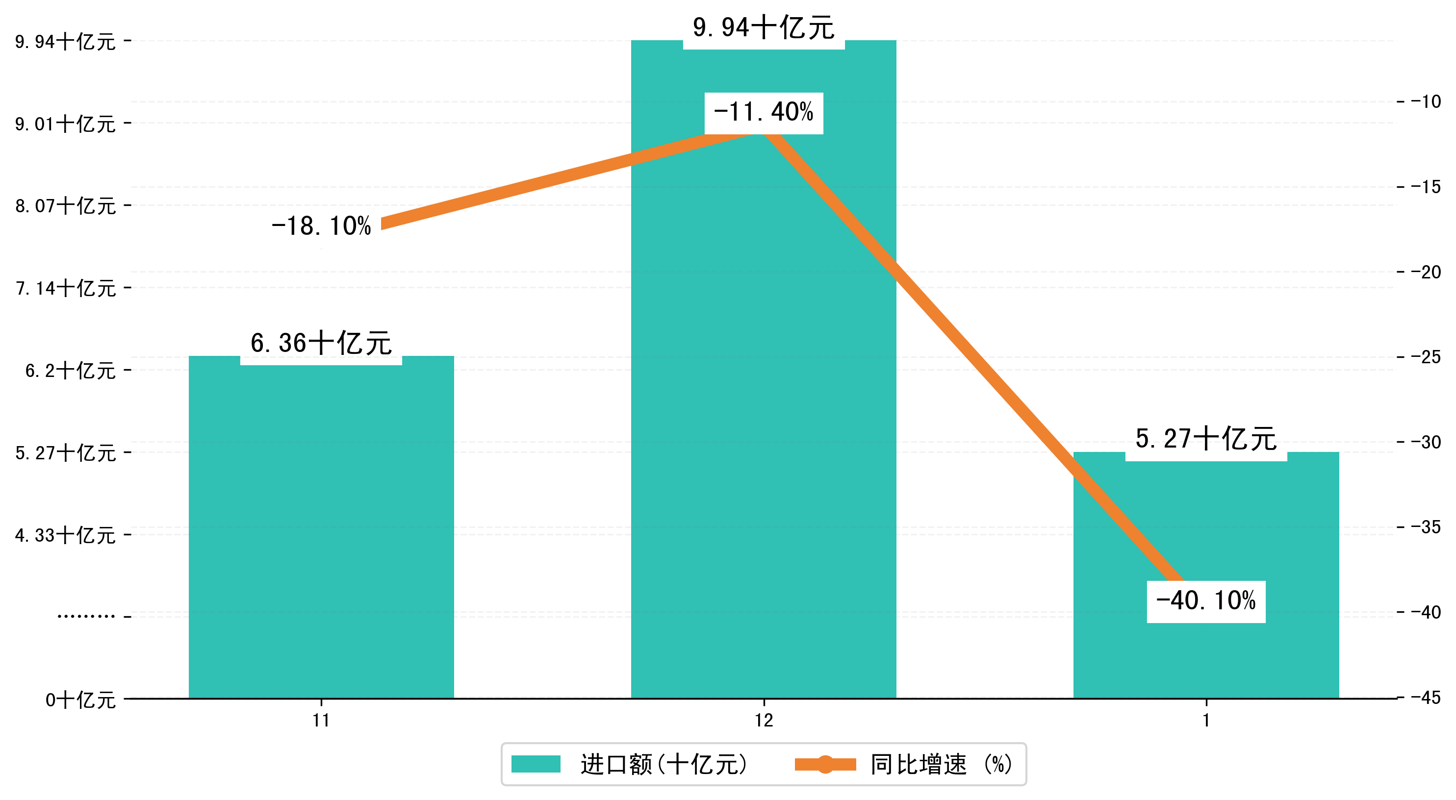 以人民币计,2023年1-1月长春市进口额为52,6948.5653万元,相比上年同期减少了35,5276.2001万元,同比减少了-40.10%。