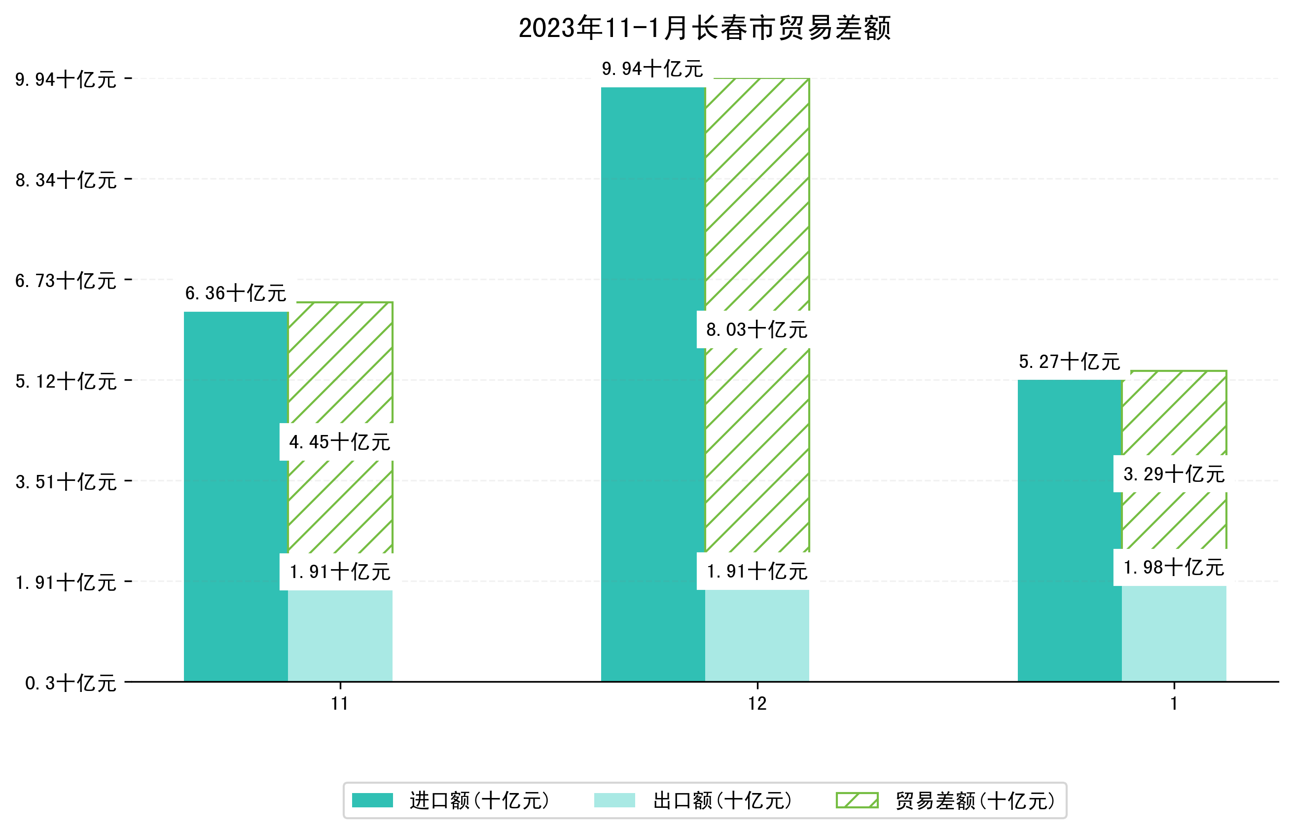 以人民币计,2023年1月长春市贸易差额为32,9324,1577万元(贸易逆差),相比上月增加了47,3671,7858万元,即6,6580,7347万美元;相比上年同期增加了37,9099,6829万元,同比增加-53.51%。