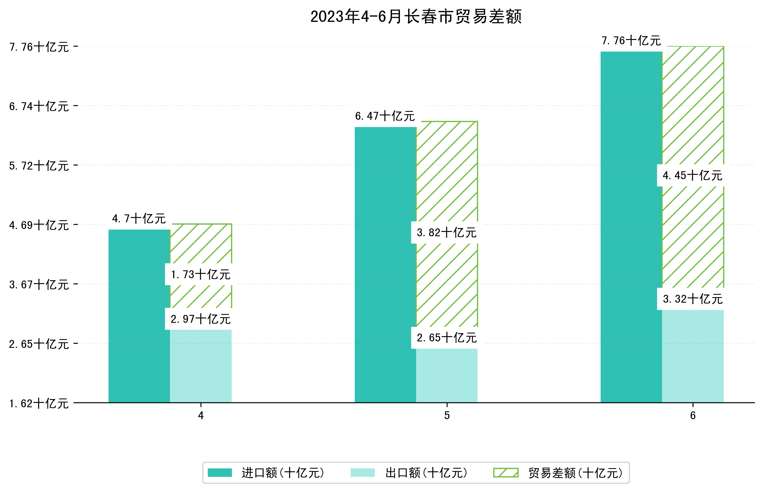 以人民币计,2023年6月长春市贸易差额为44,4862,0323万元(贸易逆差),相比上月减少了6,2968,7982万元,即7585,0003万美元;相比上年同期增加了19,1602,8221万元,同比增加-30.1%。
