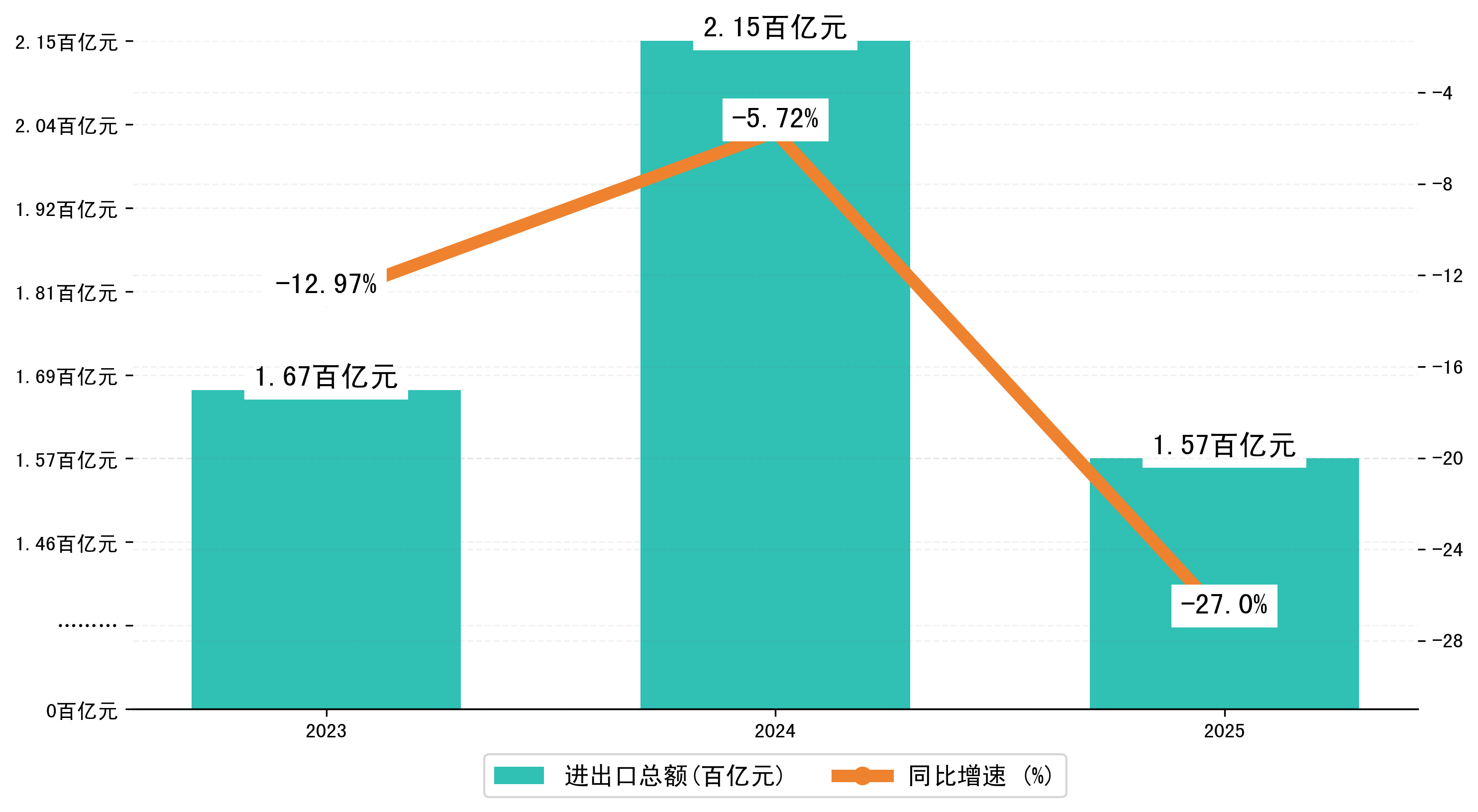 以人民币计,2025年1-2月长春市进出口总额为157,2626.7862万元,相比上年同期减少了58,1594.6438万元,同比减少了-27.00%。