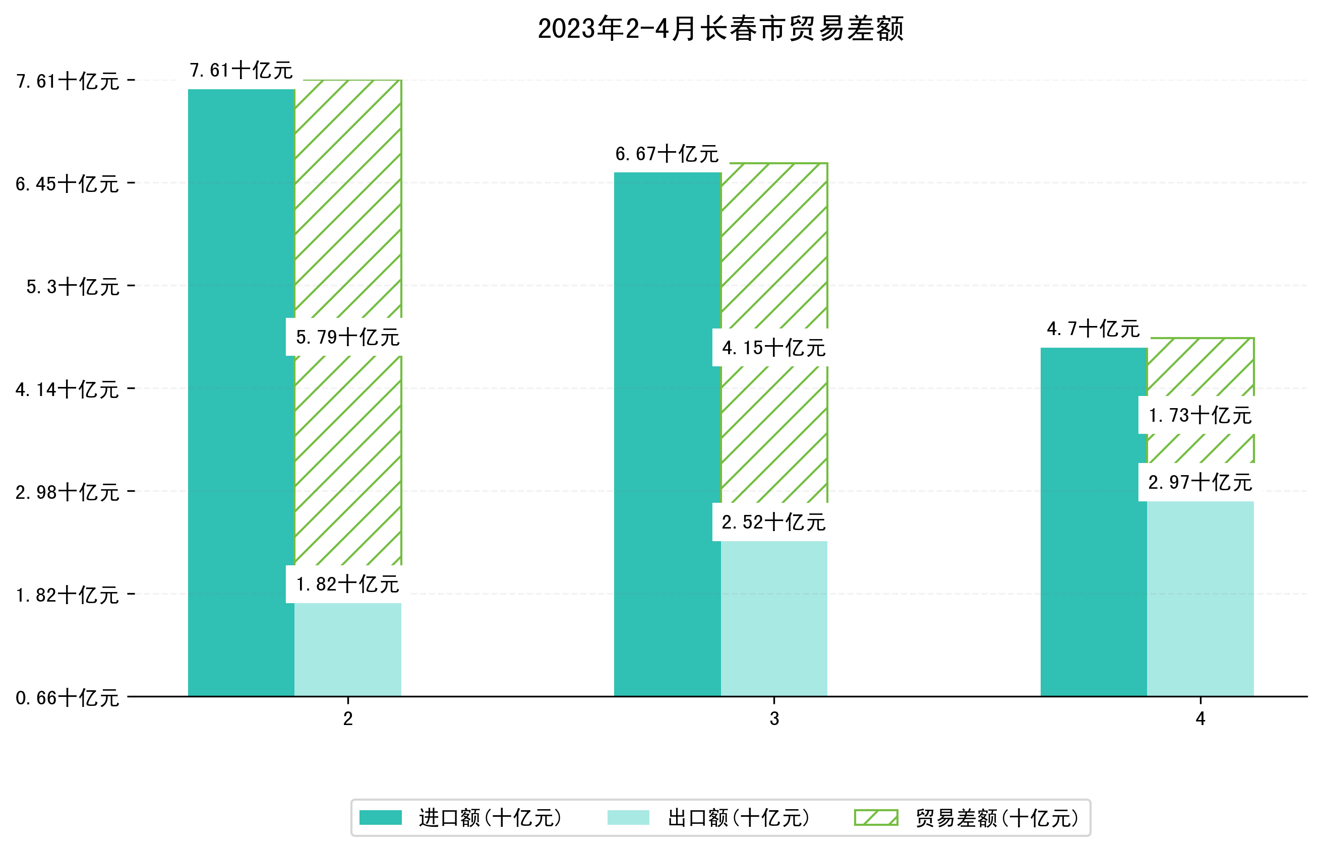 以人民币计,2023年4月长春市贸易差额为17,2832,9638万元(贸易逆差),相比上月增加了24,2386,9858万元,即3,5390,2542万美元;相比上年同期增加了53,5306,6064万元,同比增加-75.59%。