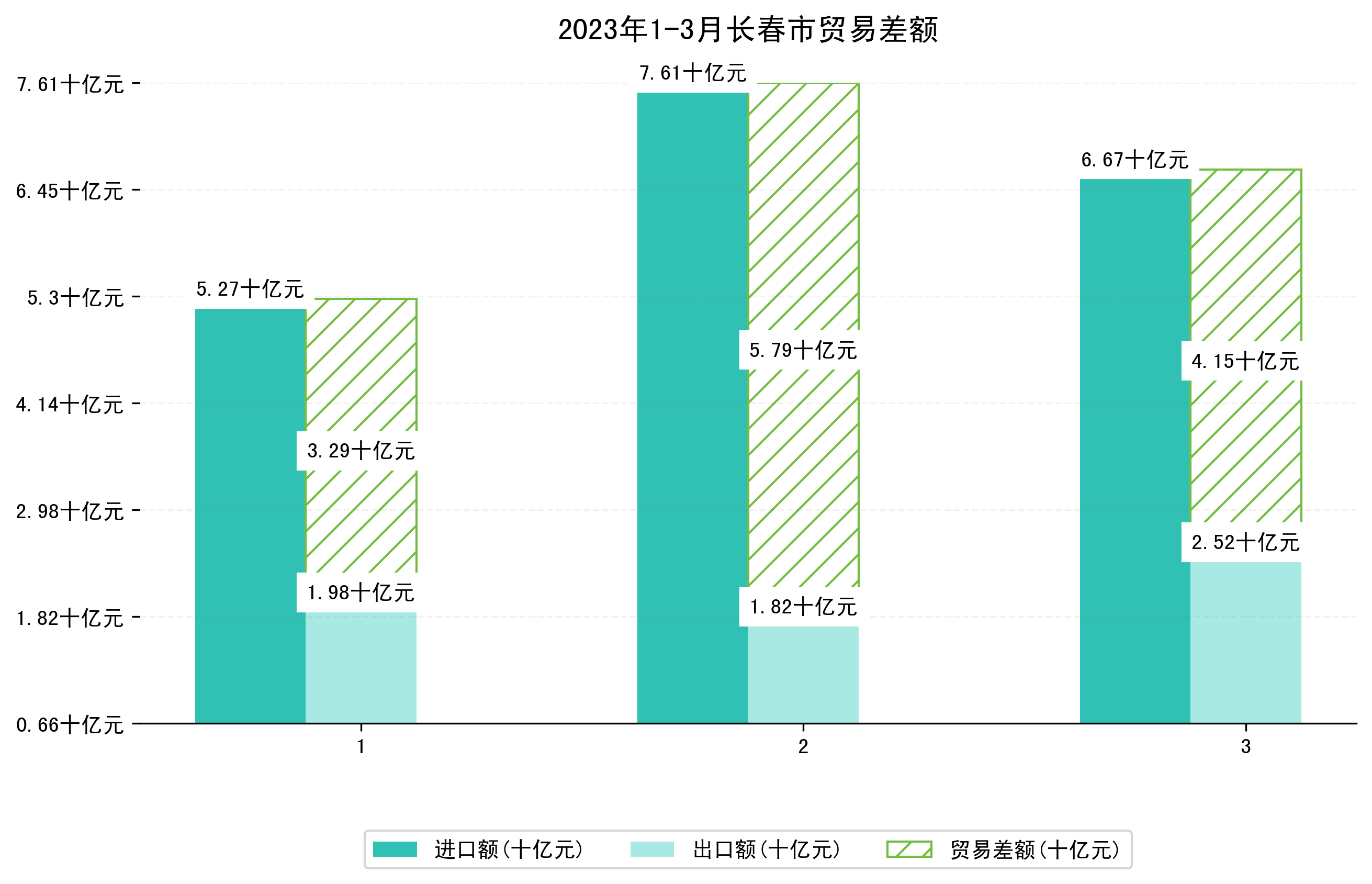 以人民币计,2023年3月长春市贸易差额为41,5219,9496万元(贸易逆差),相比上月增加了16,3811,7457万元,即2,3335,0906万美元;相比上年同期减少了2,6655,4728万元,同比减少6.86%。