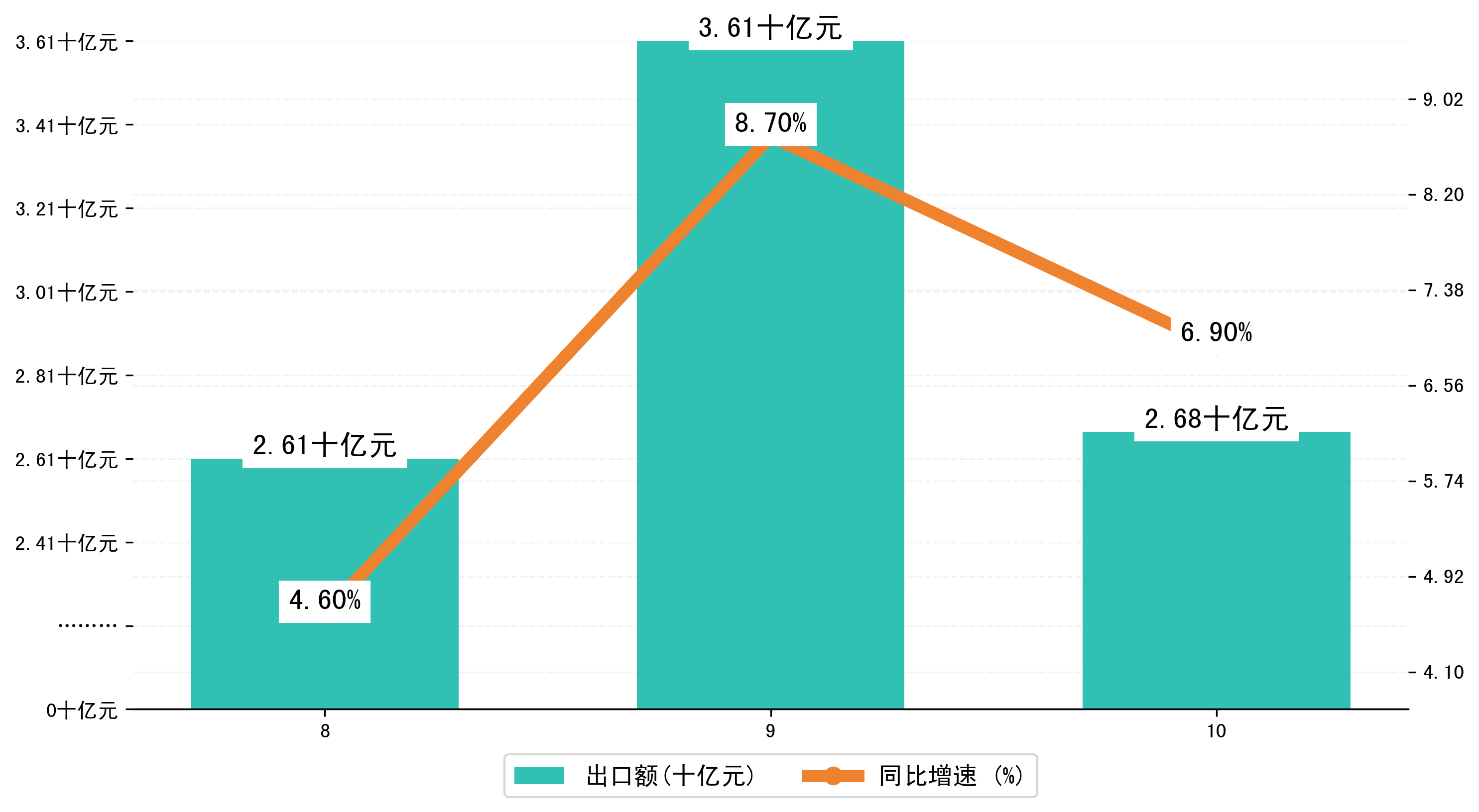 以人民币计,2024年1-10月长春市出口额为290,2504.7188万元,相比上年同期增加了18,8031.5195万元,同比增加了6.90%。