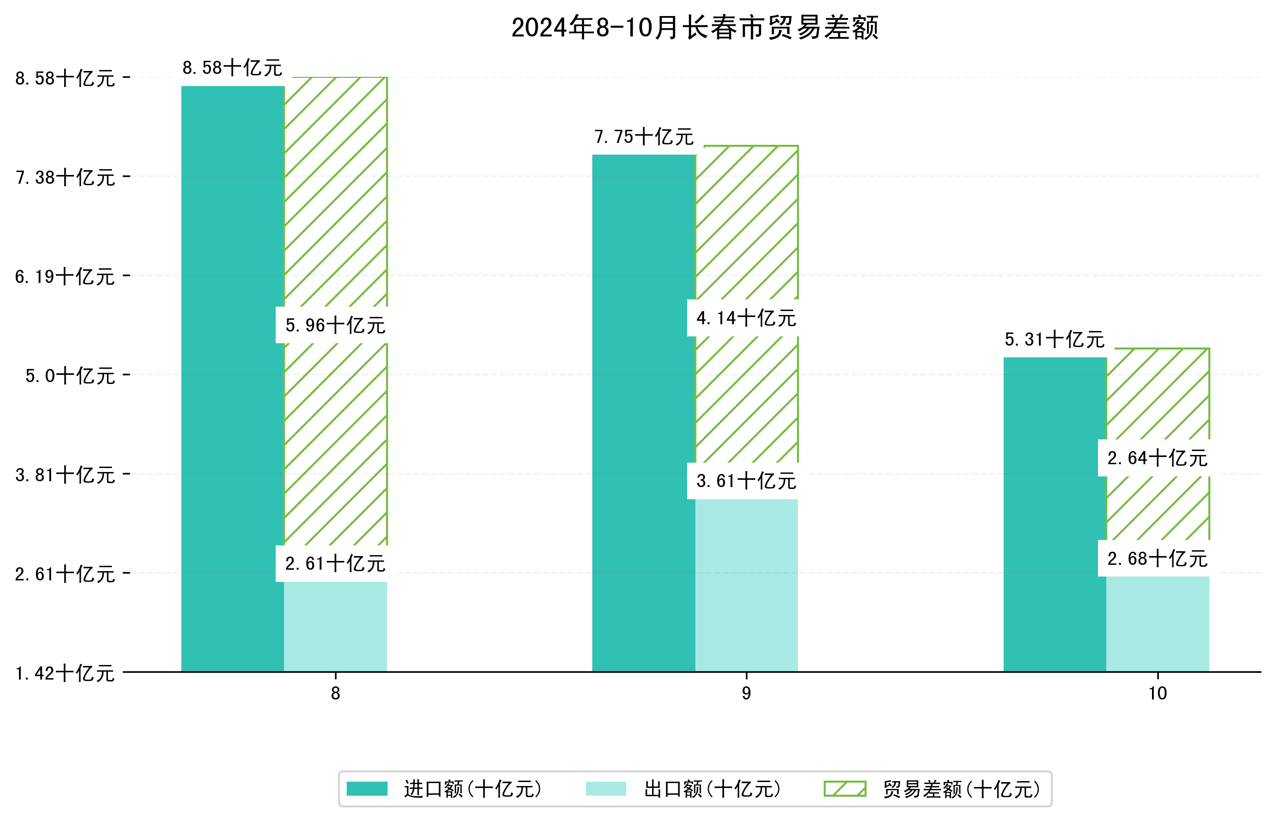 以人民币计,2024年1-10月长春市贸易差额为487,5679,0425万元(贸易逆差),相比上年同期减少了38,2013,4438万元,同比减少8.5%。