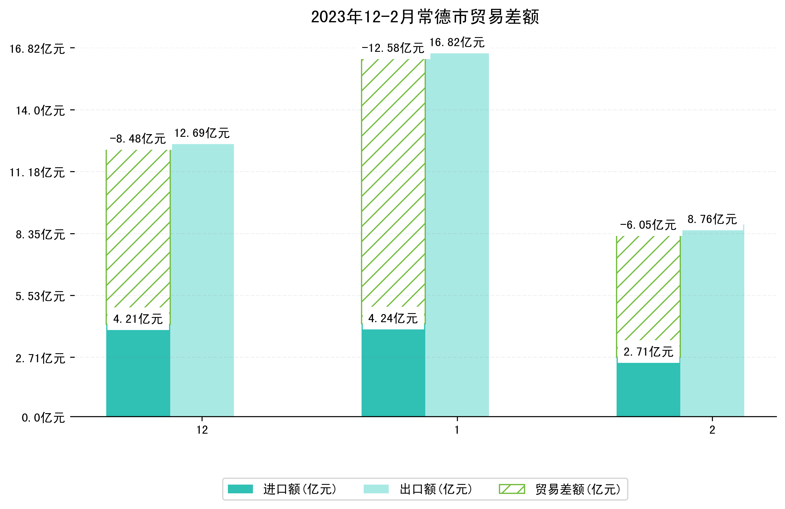 以人民币计,2023年1-2月常德市贸易差额为18,6317,1637万元(贸易顺差),相比上年同期增加了5,7665,6701万元,同比增加44.82%。