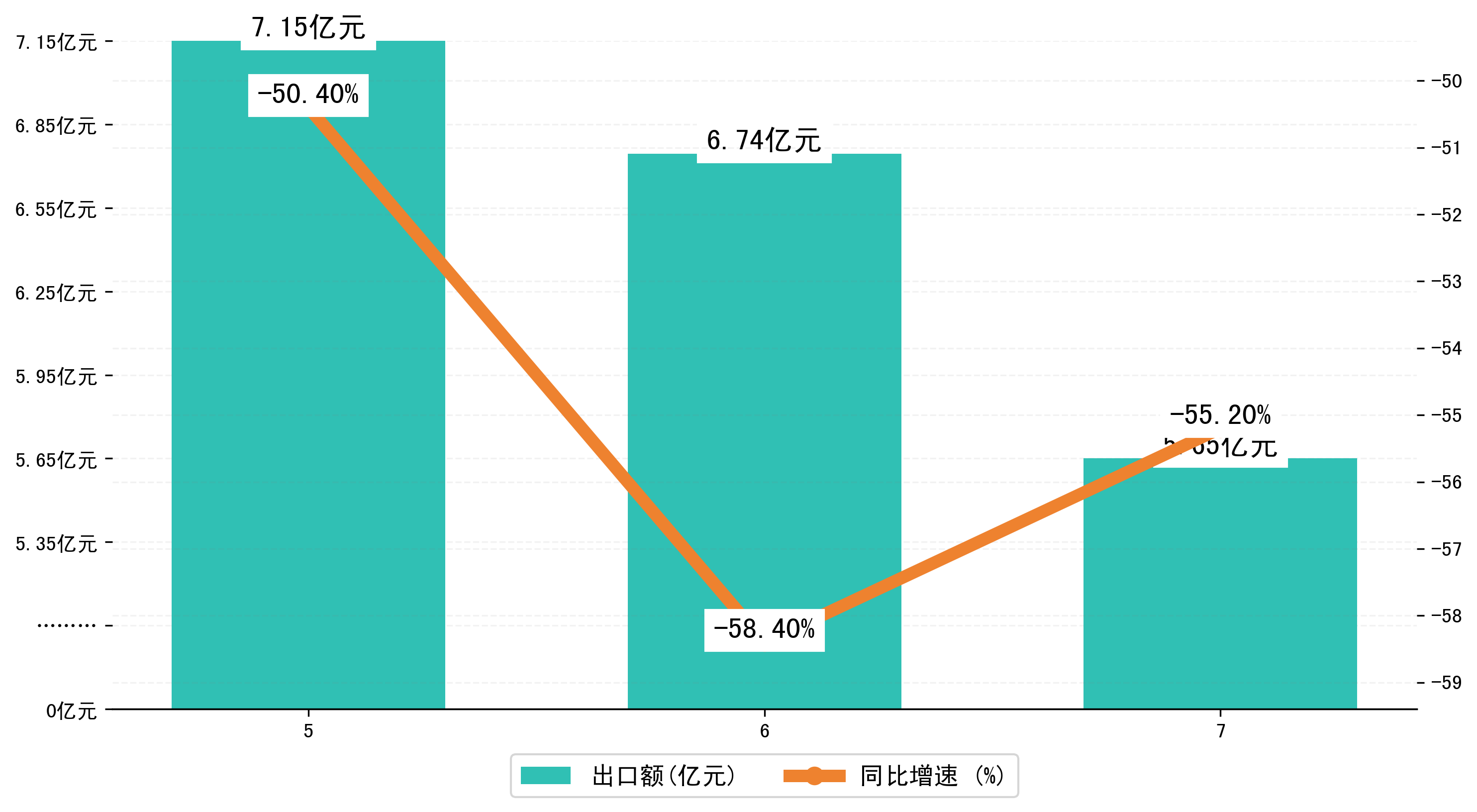 以人民币计,2024年7月常德市出口额为5,6451.6685万元,相比上月减少了1,0947.1665万元;相比上年同期减少了1,0452.3612万元,同比减少了-55.20%。