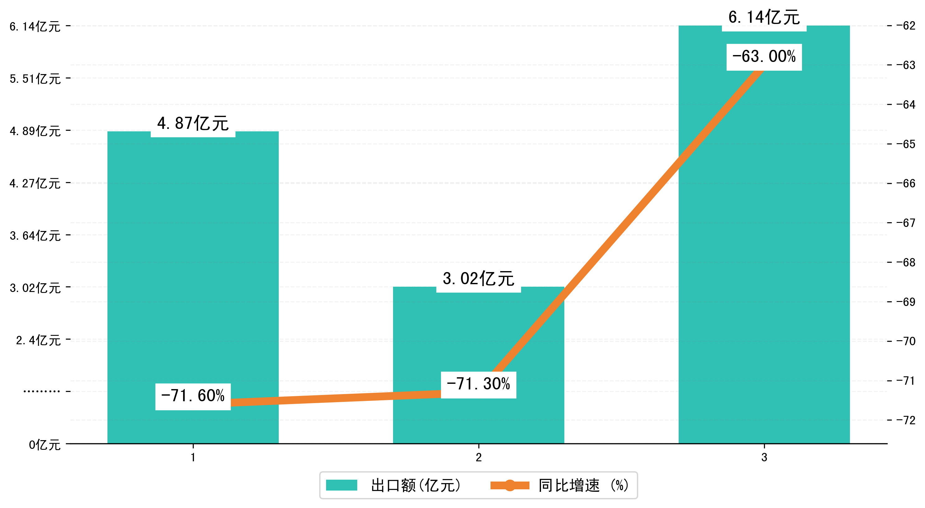 以美元计,2024年1-3月常德市出口额为1,9761.8638万美元,相比上年同期减少了3,1167.0887万美元,同比减少-64.10%。