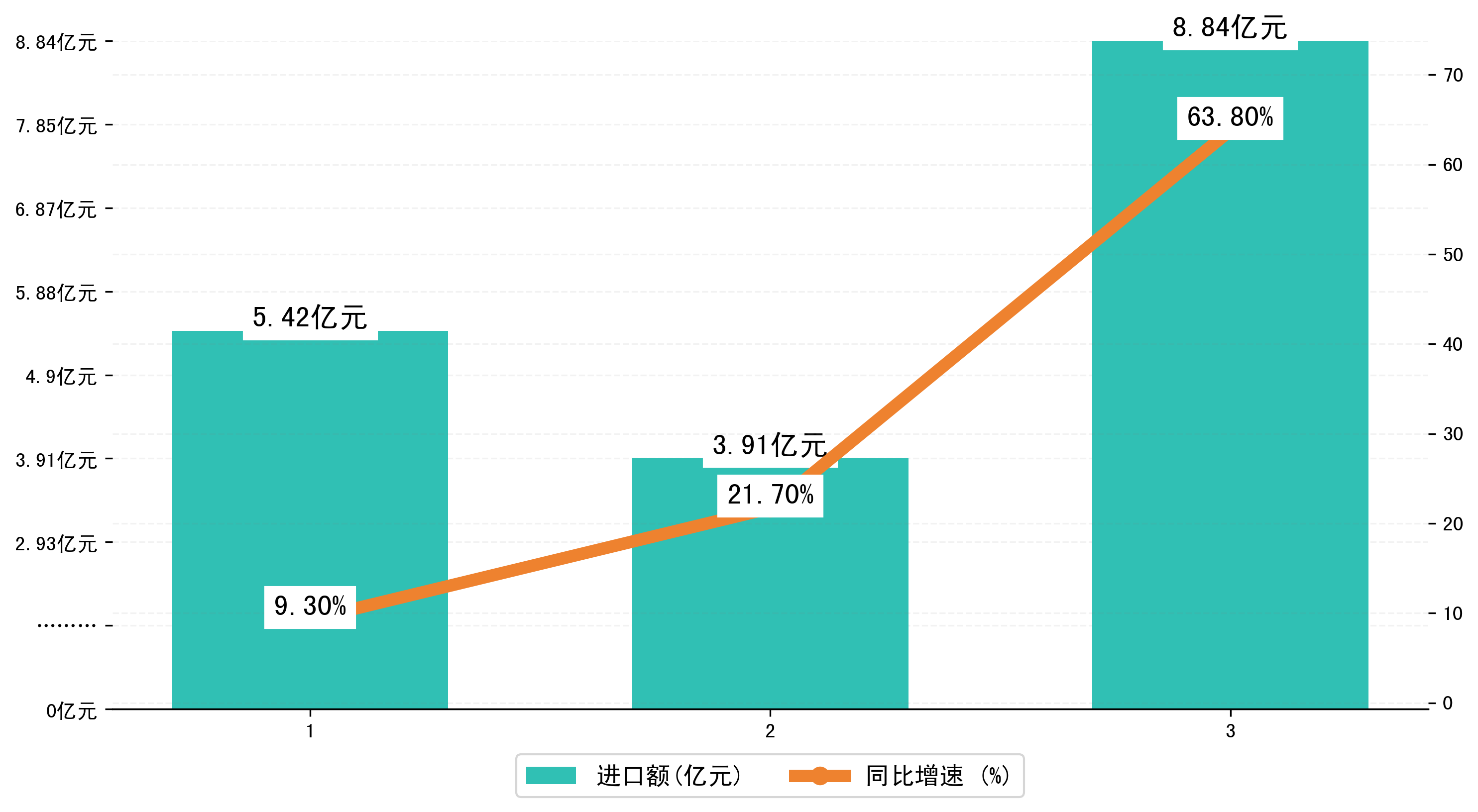 以人民币计,2024年3月常德市进口额为8,8357.7881万元,相比上月增加了4,9234.6747万元;相比上年同期增加了5,4187.6285万元,同比增加了63.80%。