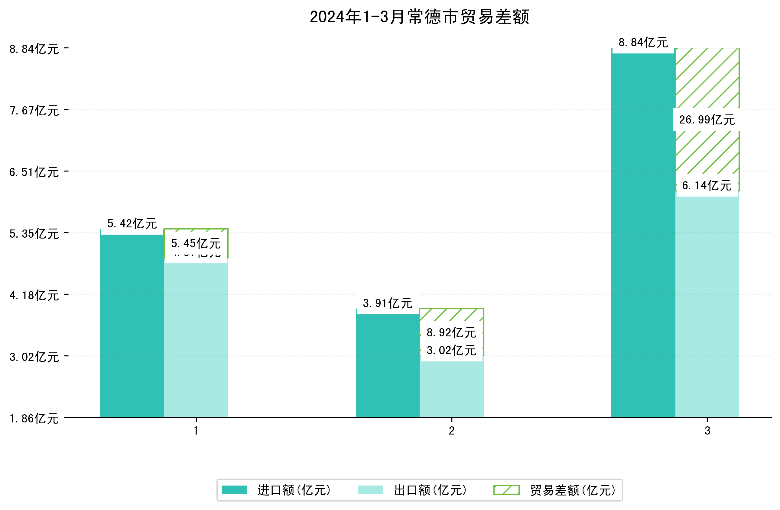 以人民币计,2024年1-3月常德市贸易差额为4,1359,4751万元(贸易逆差),相比上年同期减少了28,9020,9473万元,同比减少-116.7%。