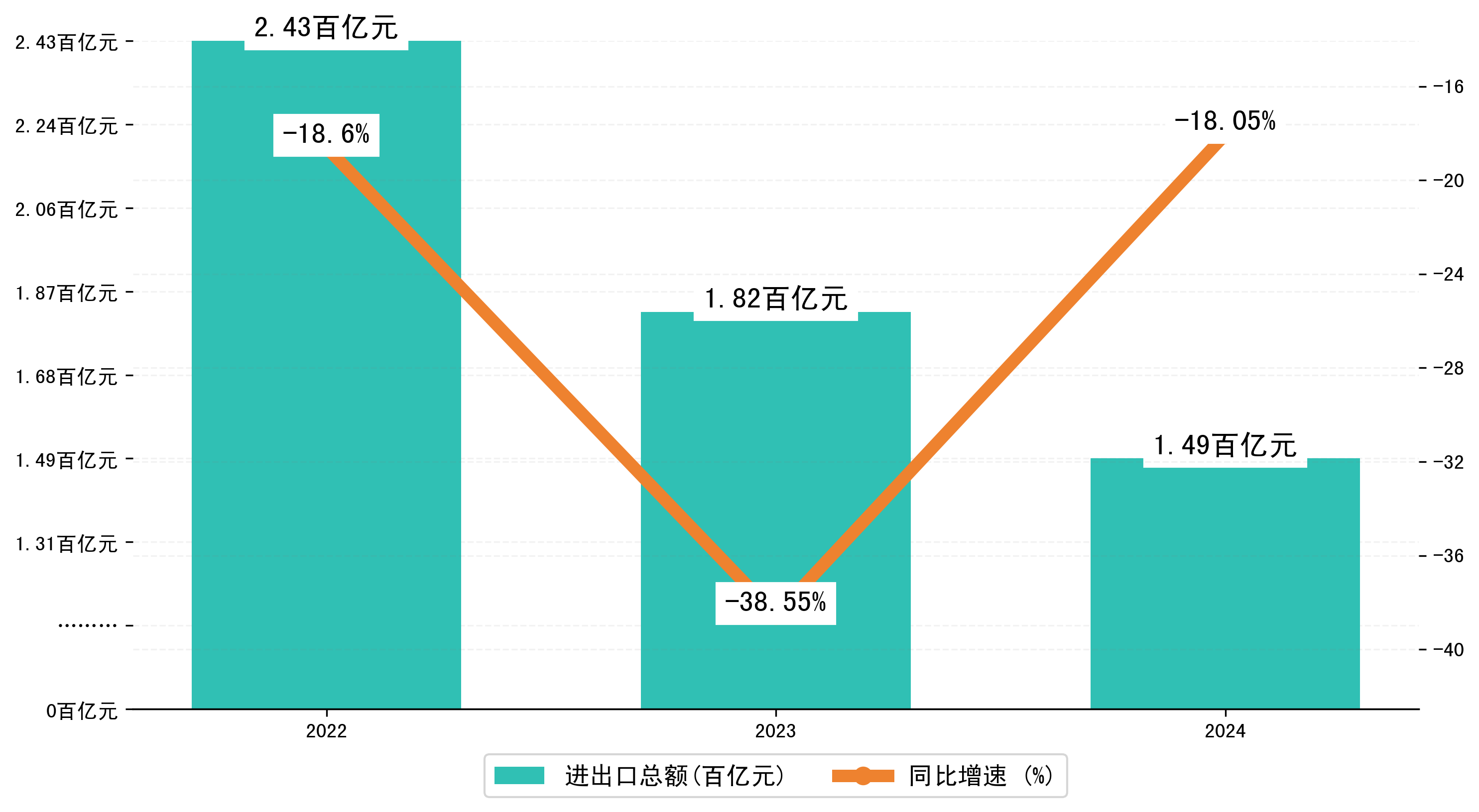 以人民币计,2024年1-12月常德市进出口总额为149,3552.8973万元,相比上年同期减少了32,8983.1272万元,同比减少了-18.00%。