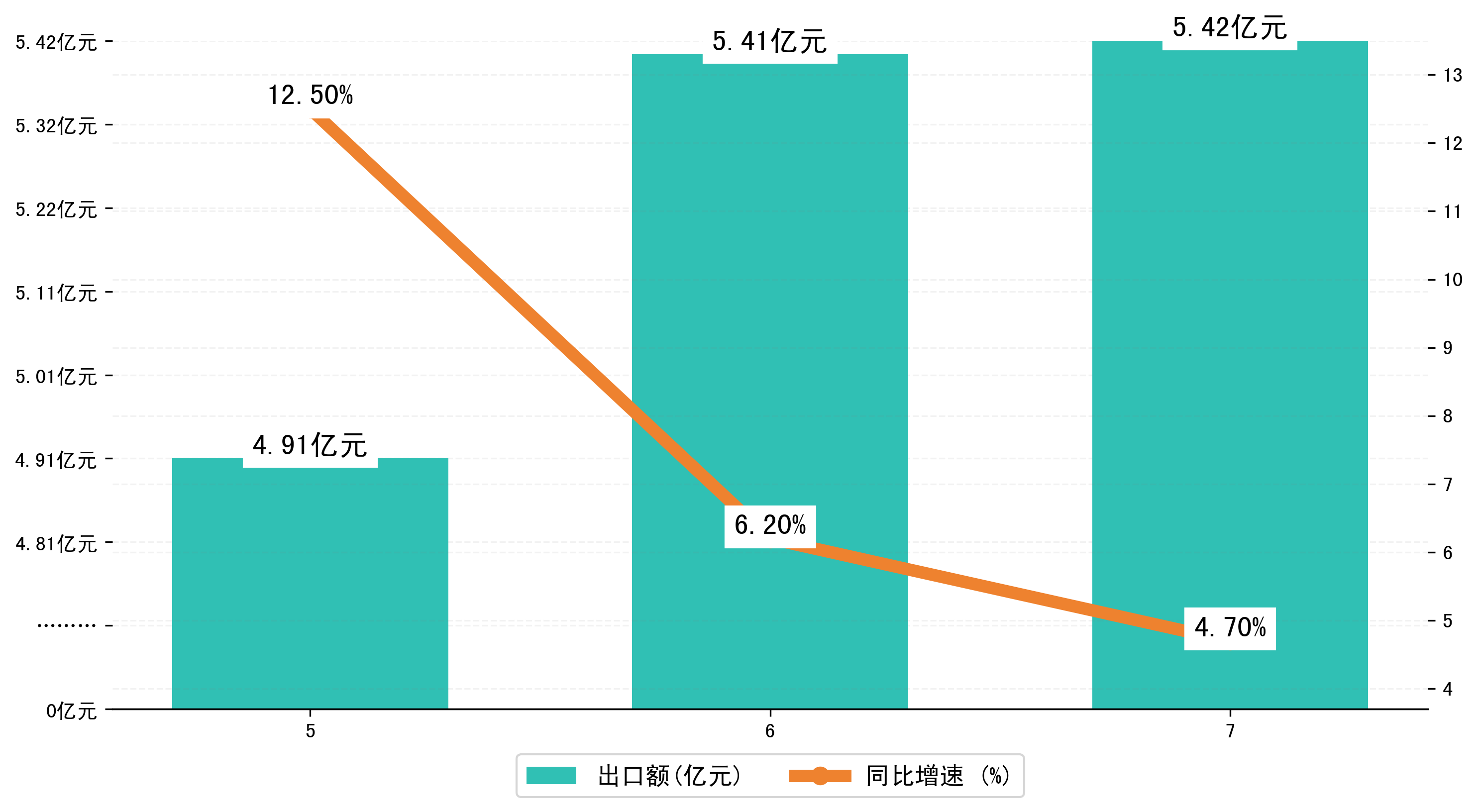 以美元计,2025年1-7月常德市出口额为5,7420.6322万美元,相比上年同期增加了1899.8322万美元,同比增加3.60%。