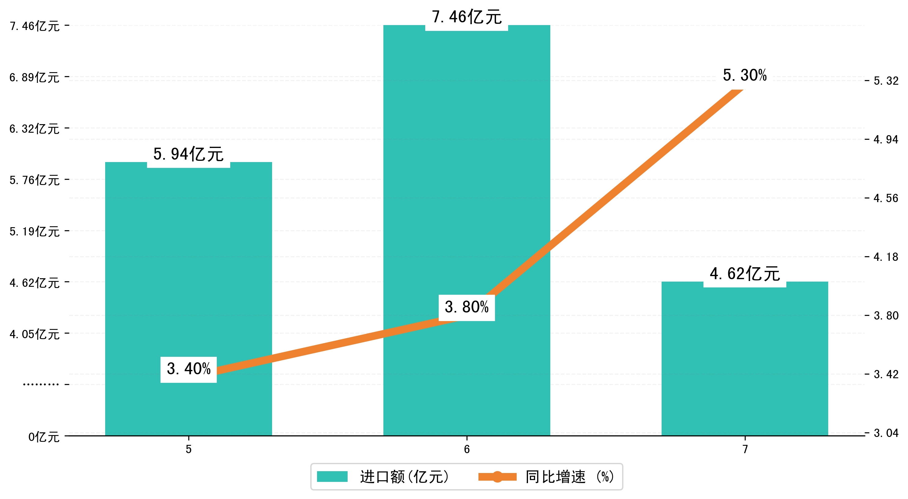 以美元计,2025年1-7月常德市进口额为5,6424.2713万美元,相比上年同期增加了2577.6701万美元,同比增加4.10%。