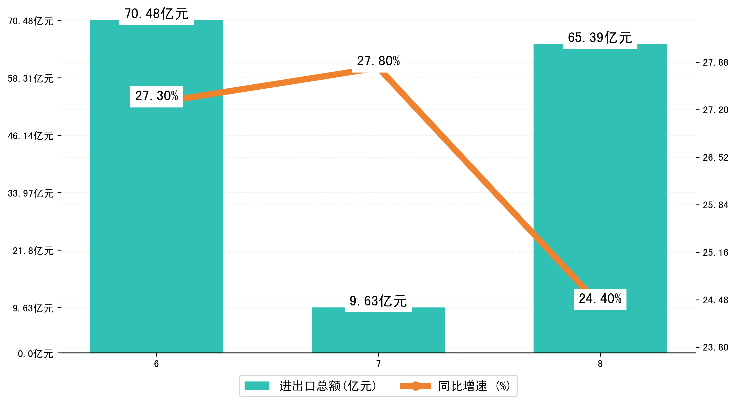 以美元计,2025年8月黑河市贸易差额为7,2397,8127万美元(贸易逆差),相比上月减少了8,2468,2308万美元;相比上年同期减少了6678,4691万美元,同比减少10.16%。