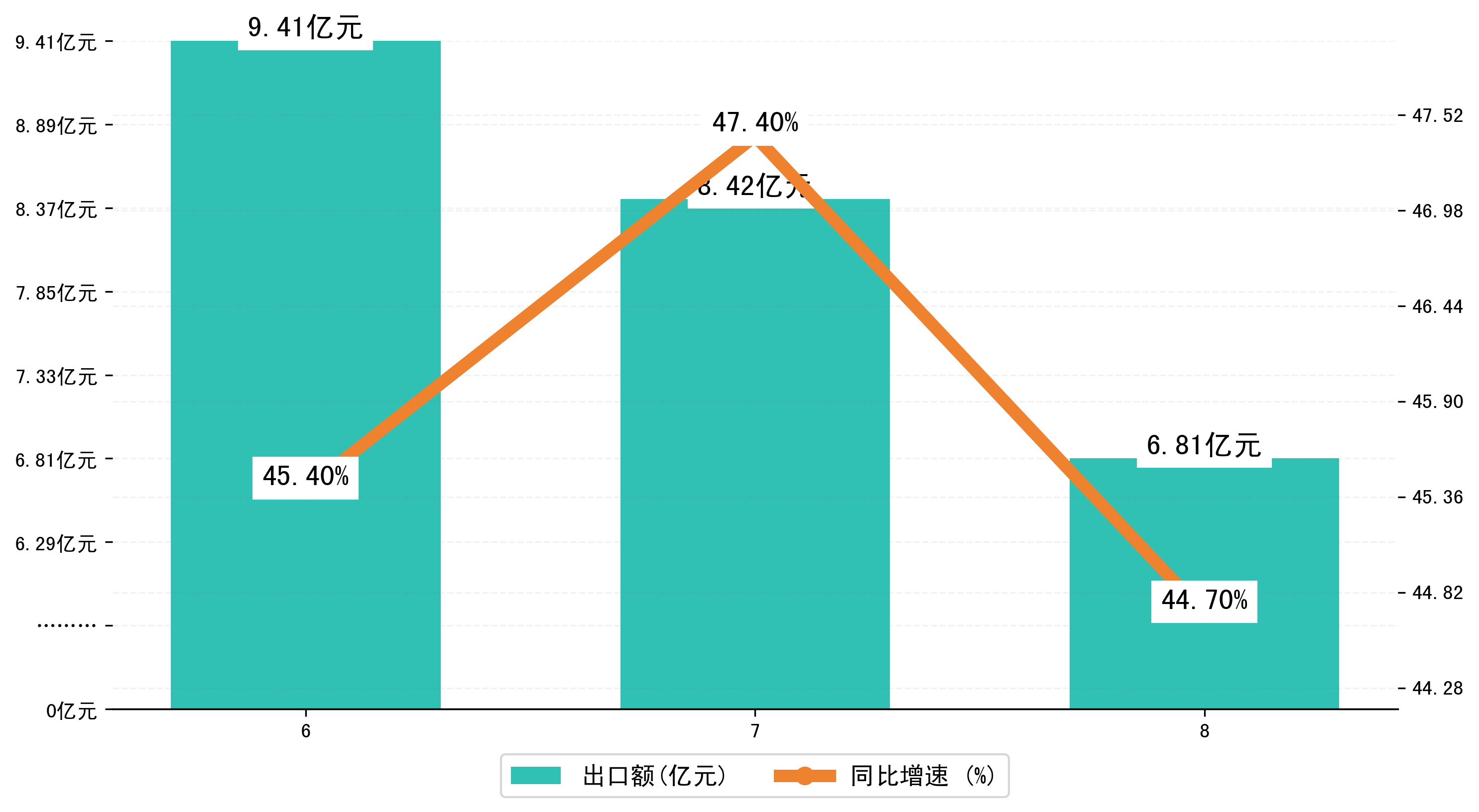 以人民币计,2025年1-8月黑河市出口额为53,6208.706万元,相比上年同期增加了16,5581.0014万元,同比增加了44.70%。
