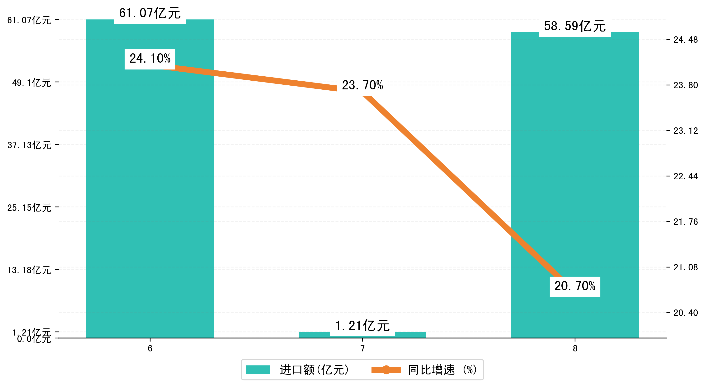 以人民币计,2025年1-8月黑河市进口额为244,1514.6475万元,相比上年同期增加了41,9280.5808万元,同比增加了20.70%。