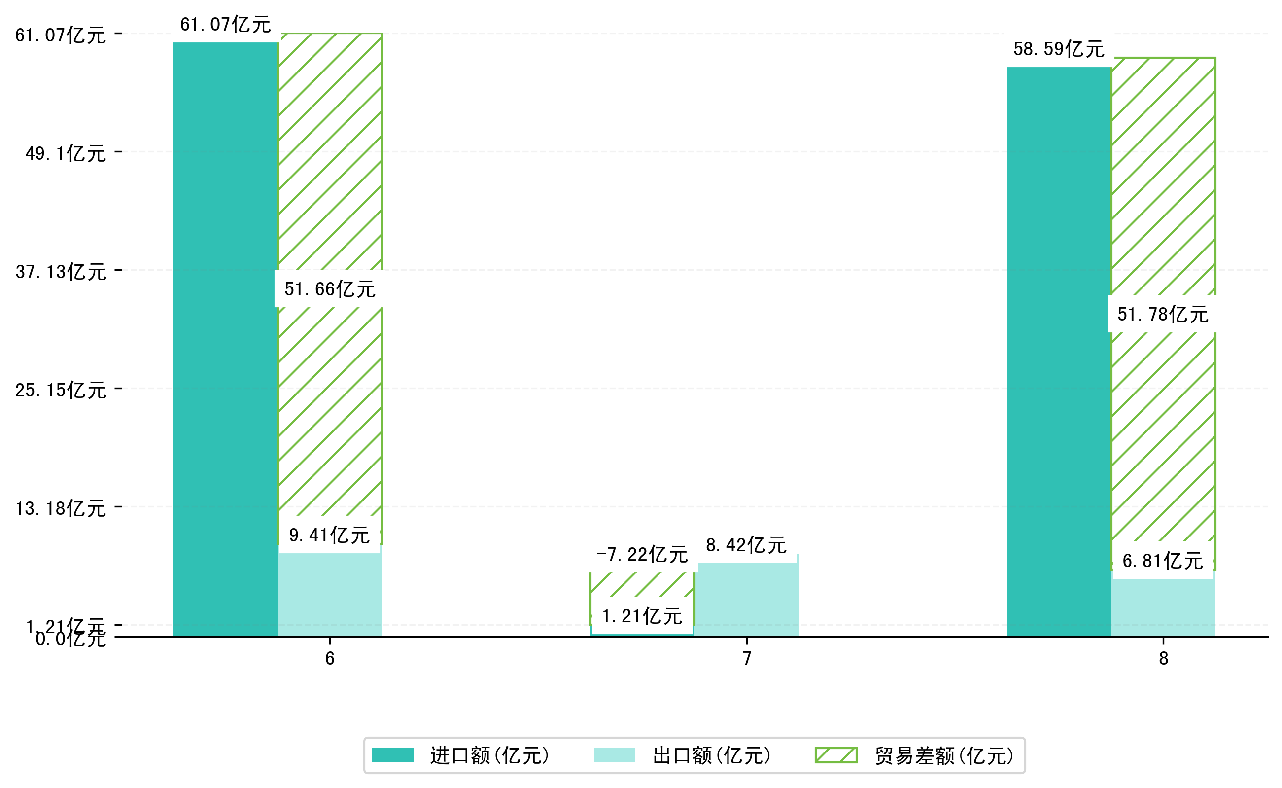 以人民币计,2025年8月黑河市贸易差额为51,7773,8656万元(贸易逆差),相比上月减少了58,9964,7174万元,即8,2468,2308万美元;相比上年同期减少了4,9049,9190万元,同比减少10.46%。