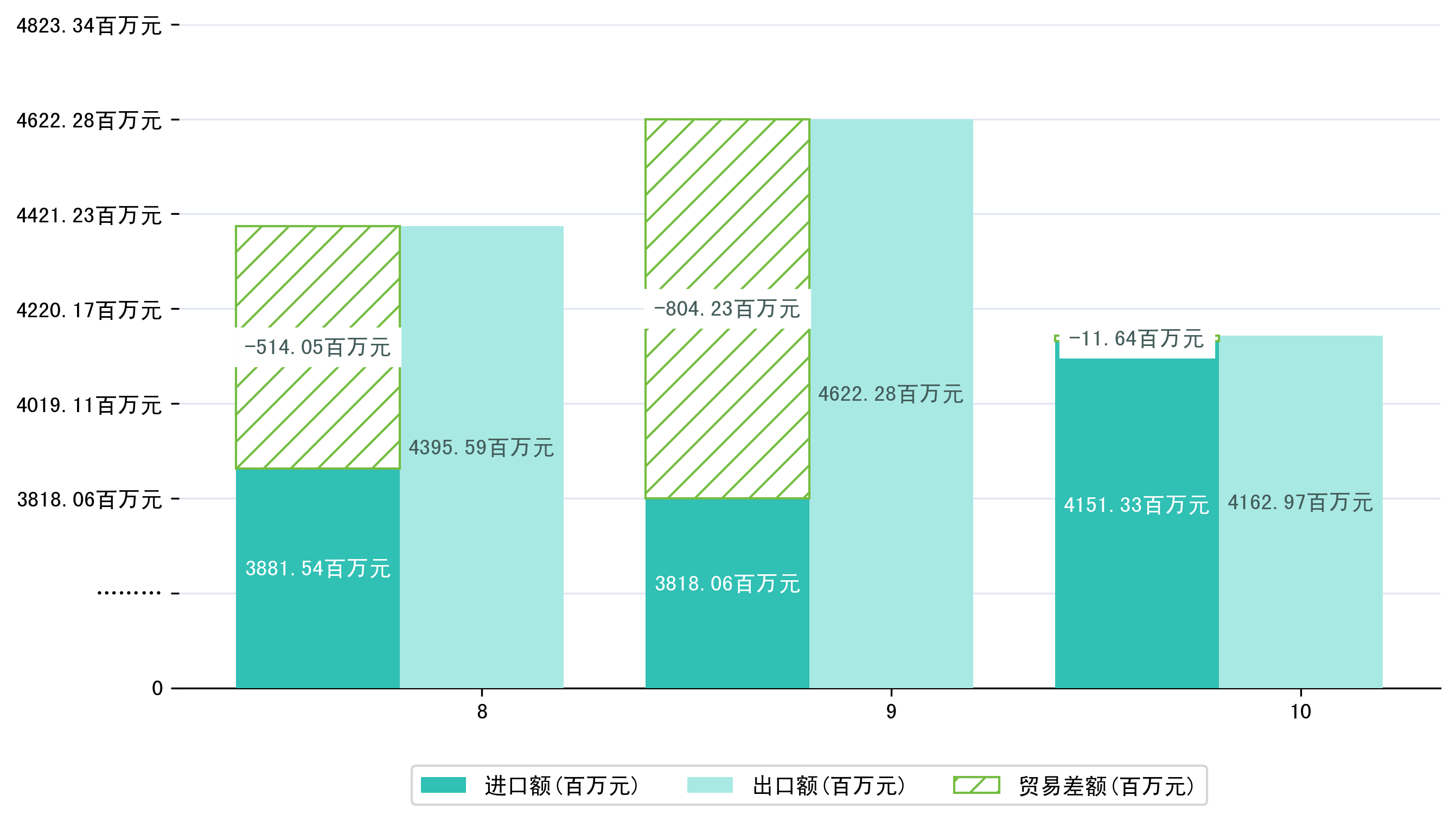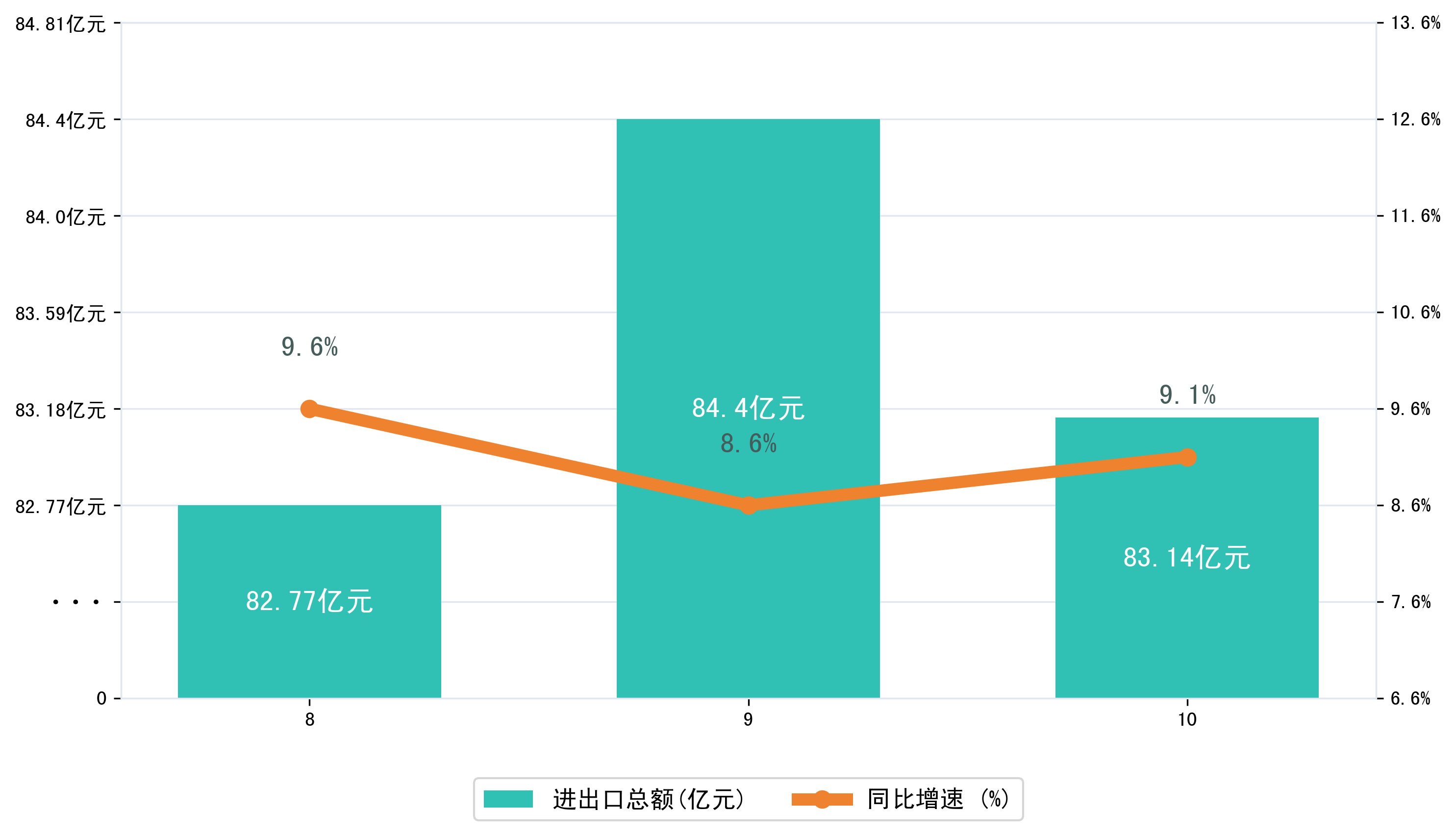 以人民币计,2025年10月南宁市进出口总额为83,1430.226万元,相比上月减少了1,2603.5554万元;相比上年同期增加了7,8034.3963万元,同比增加了9.10%。