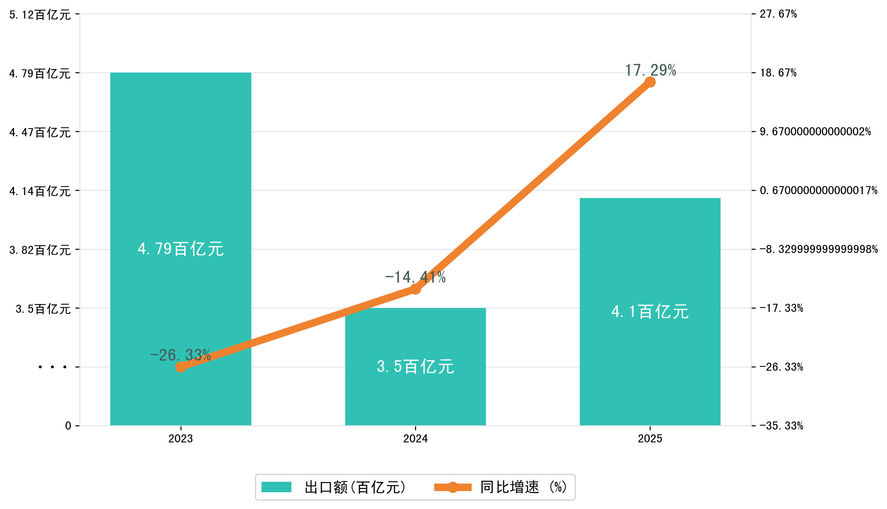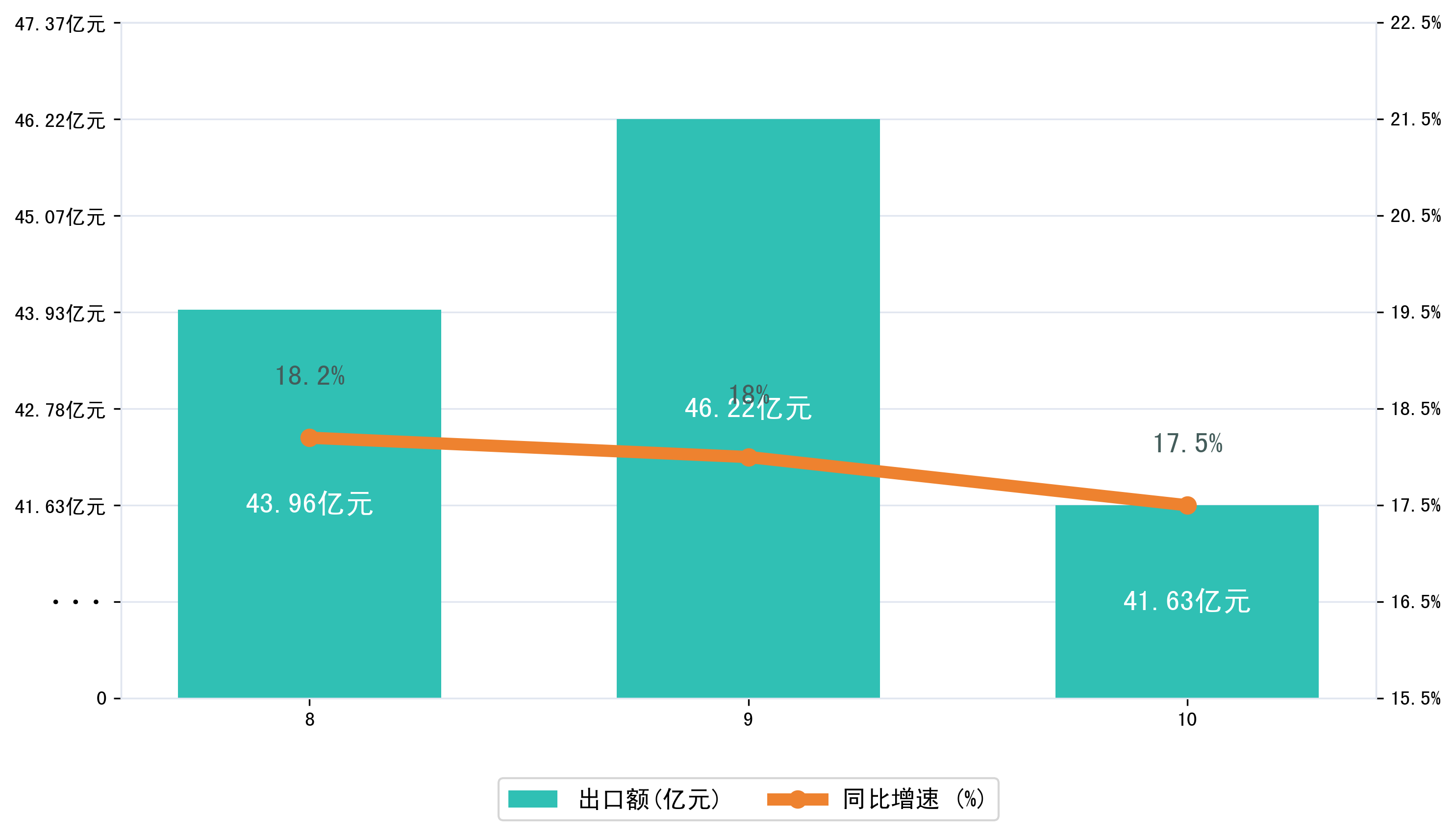 以人民币计,2025年1-10月南宁市出口额为410,1171.2048万元,相比上年同期增加了60,4470.0673万元,同比增加了17.50%。