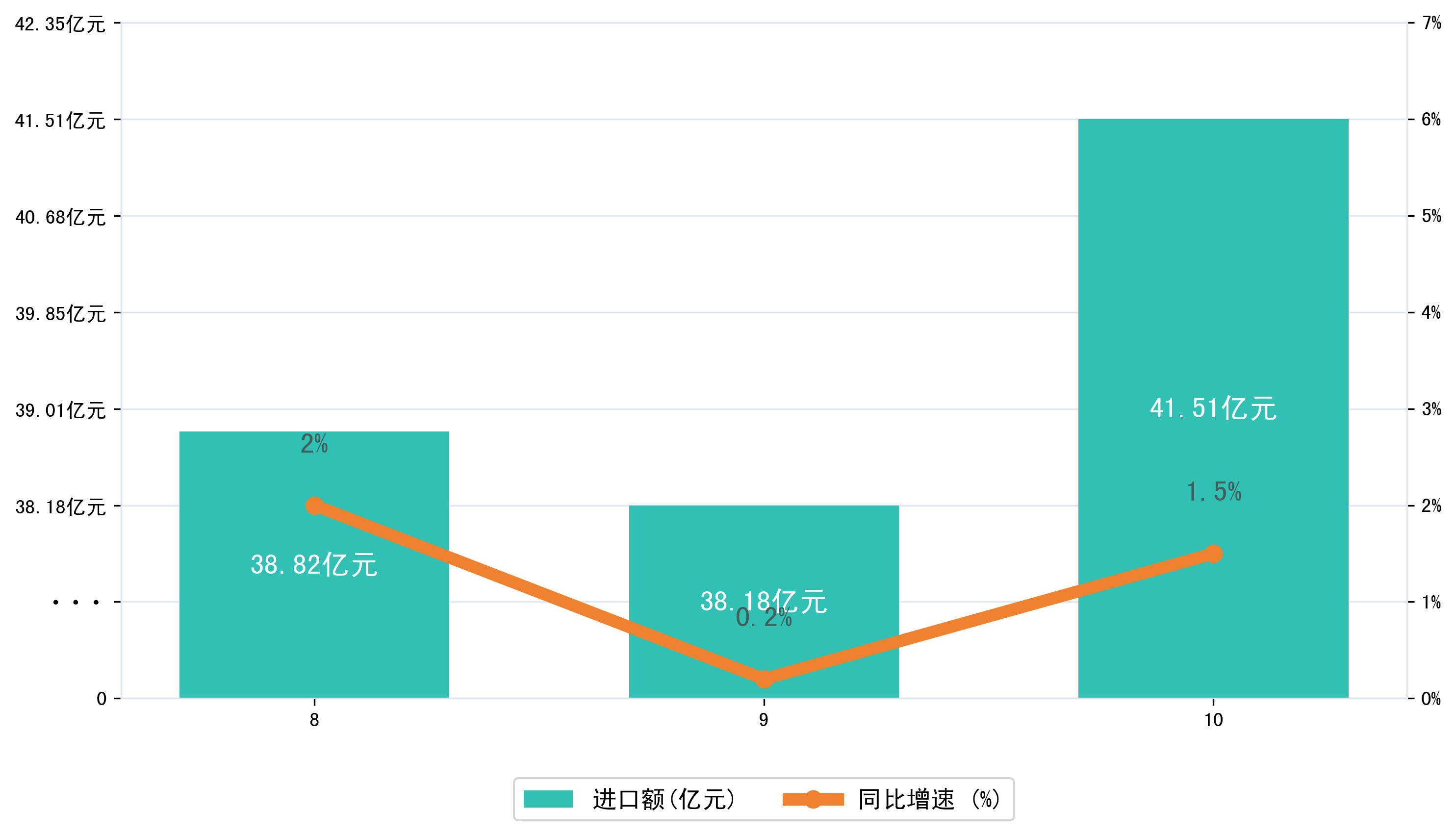 以人民币计,2025年1-10月南宁市进口额为392,2920.4166万元,相比上年同期减少了2,6578.6117万元,同比增加了1.50%。