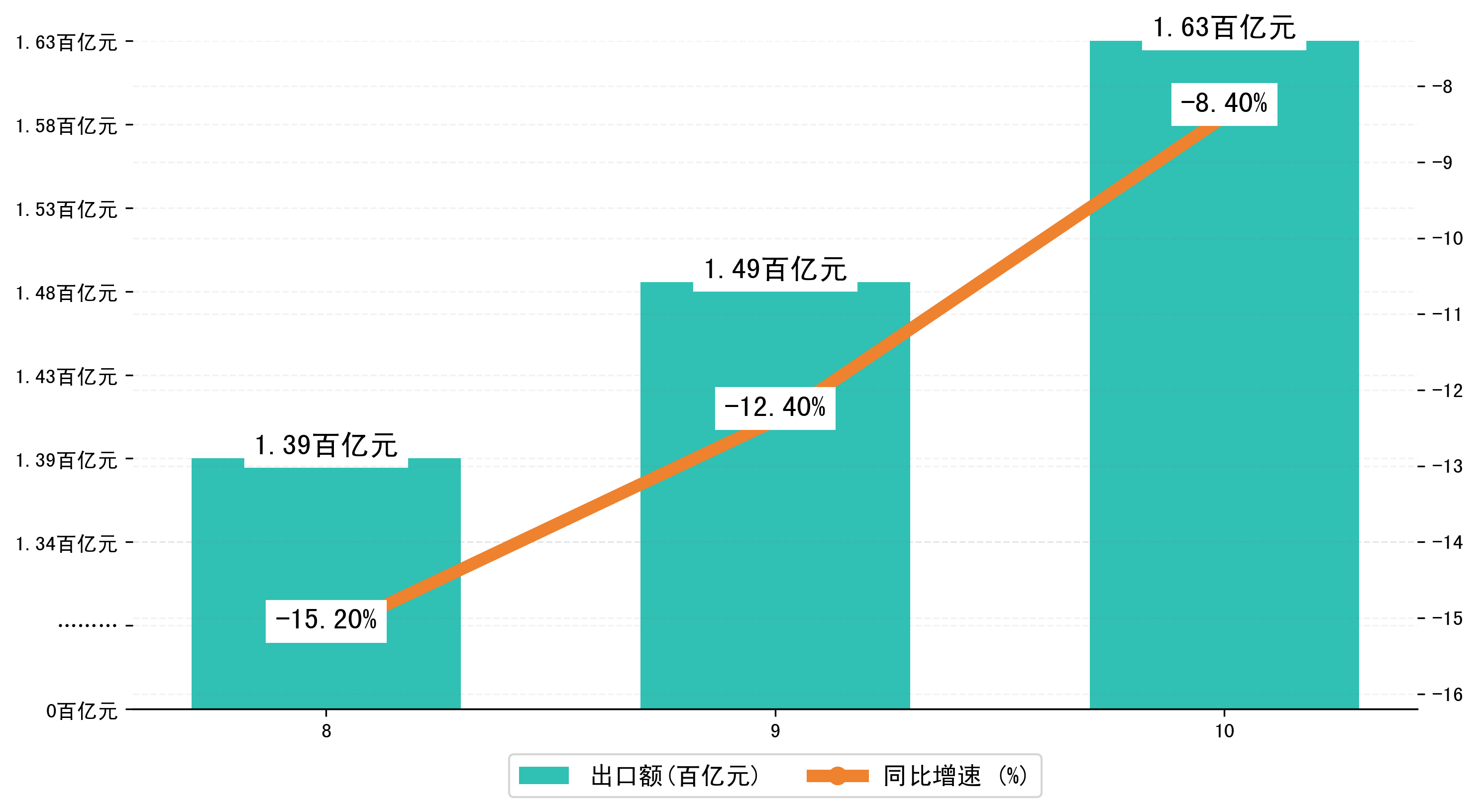 以人民币计,2024年10月长沙市出口额为162,8479.1325万元,相比上月增加了14,0295.2693万元;相比上年同期增加了58,1738.9236万元,同比减少了-8.40%。