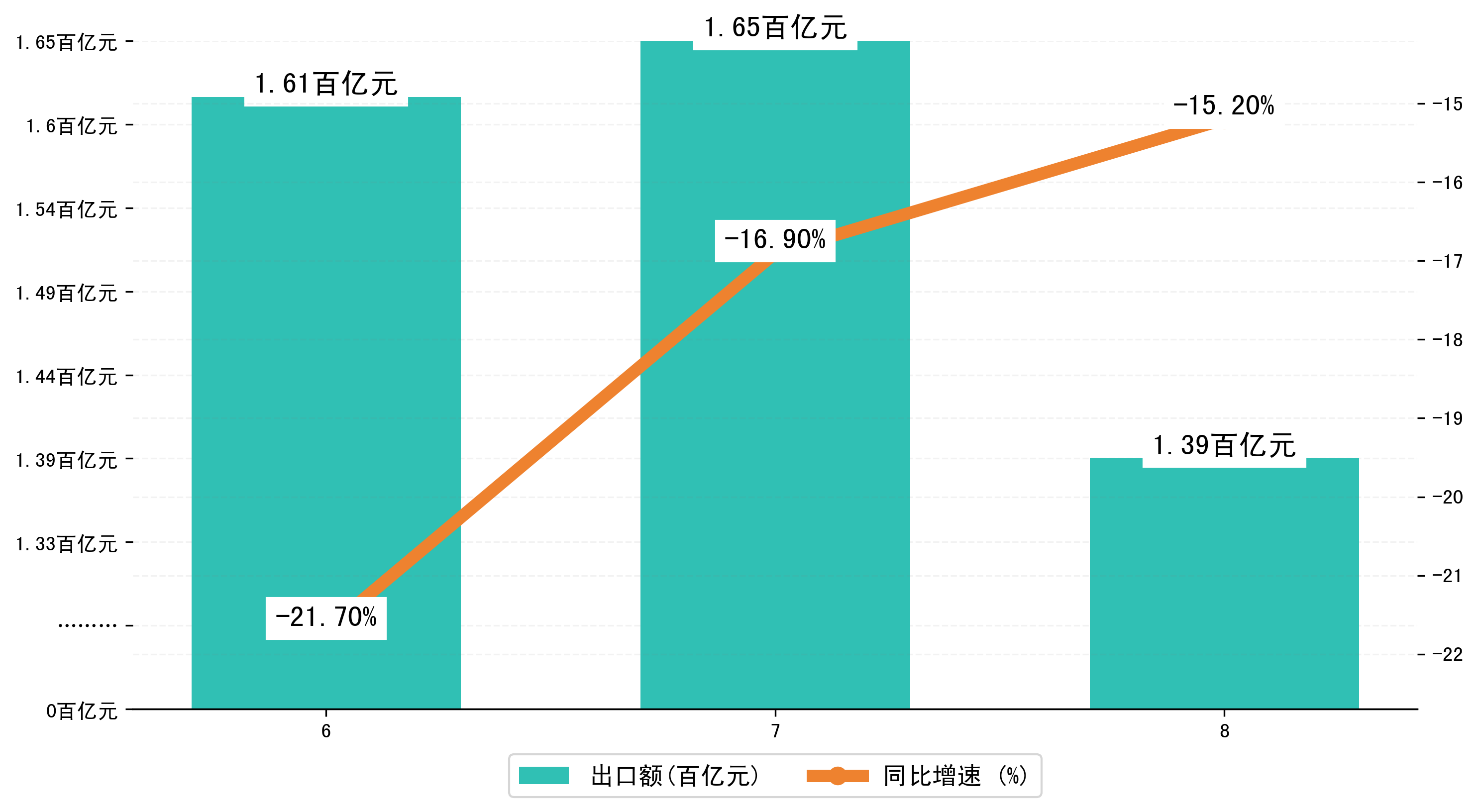 以人民币计,2024年1-8月长沙市出口额为1146,2860.2213万元,相比上年同期减少了63,6365.7169万元,同比减少了-15.20%。