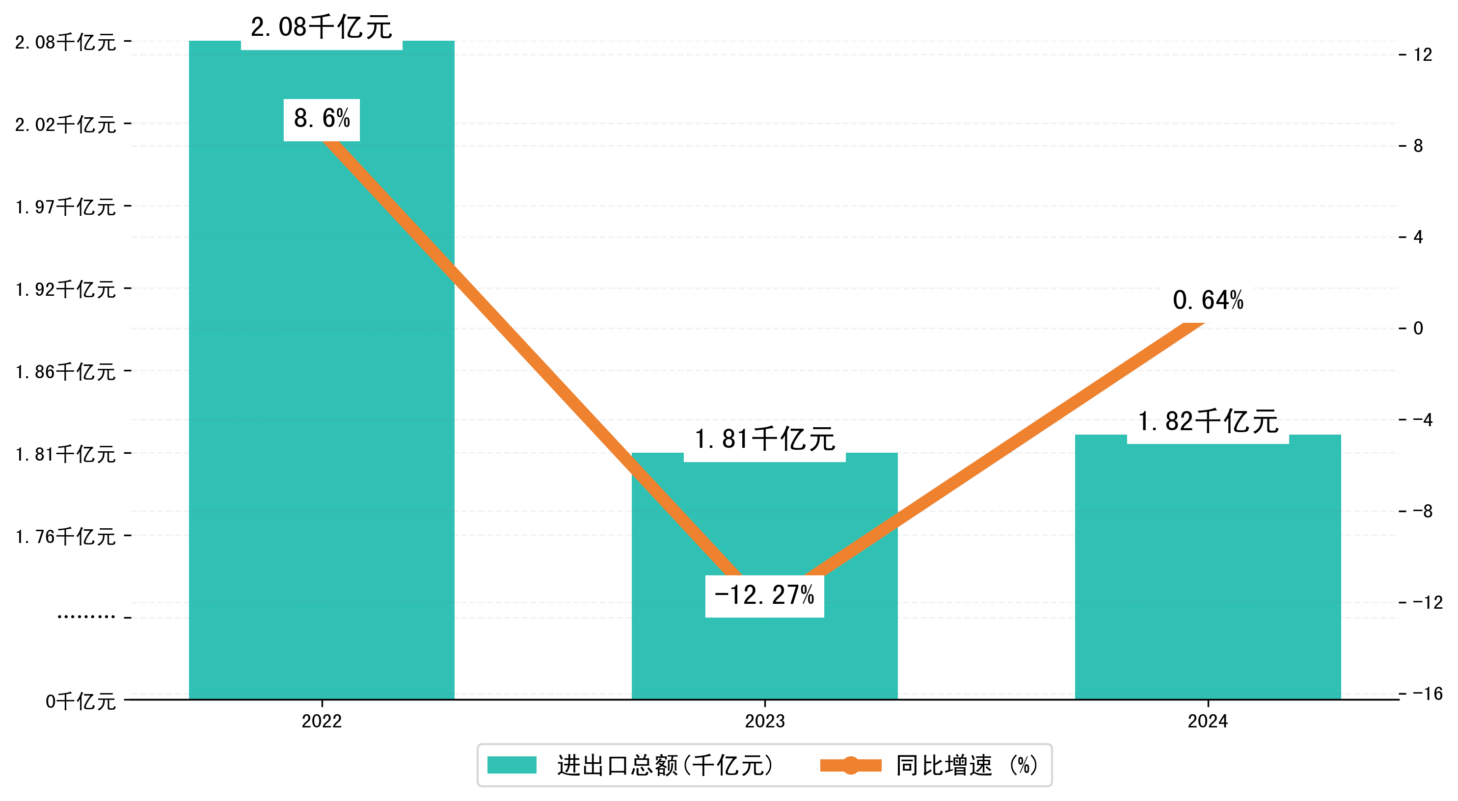 以人民币计,2024年1-8月长沙市进出口总额为1821,0496.7233万元,相比上年同期增加了11,5203.8199万元,同比减少了-6.60%。
