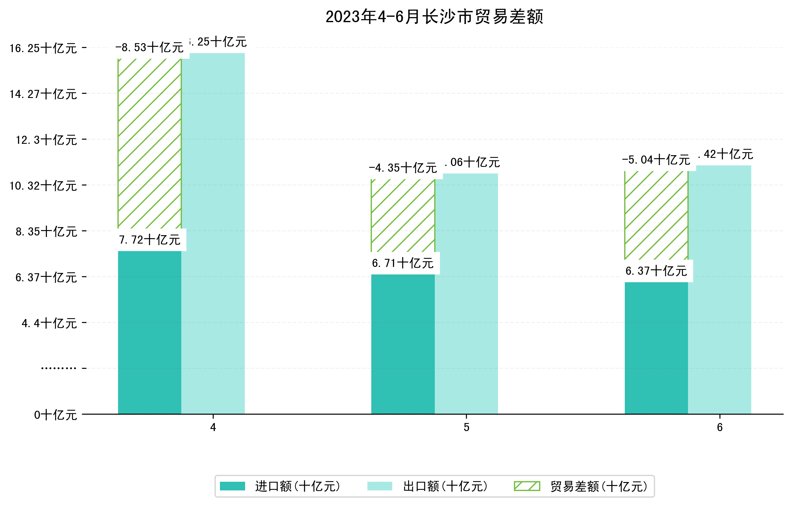 以人民币计,2023年6月长沙市贸易差额为50,4275,4107万元(贸易顺差),相比上月增加了6,9067,2005万元,即9101,0706万美元;相比上年同期减少了107,4241,3219万元,同比减少-68.05%。