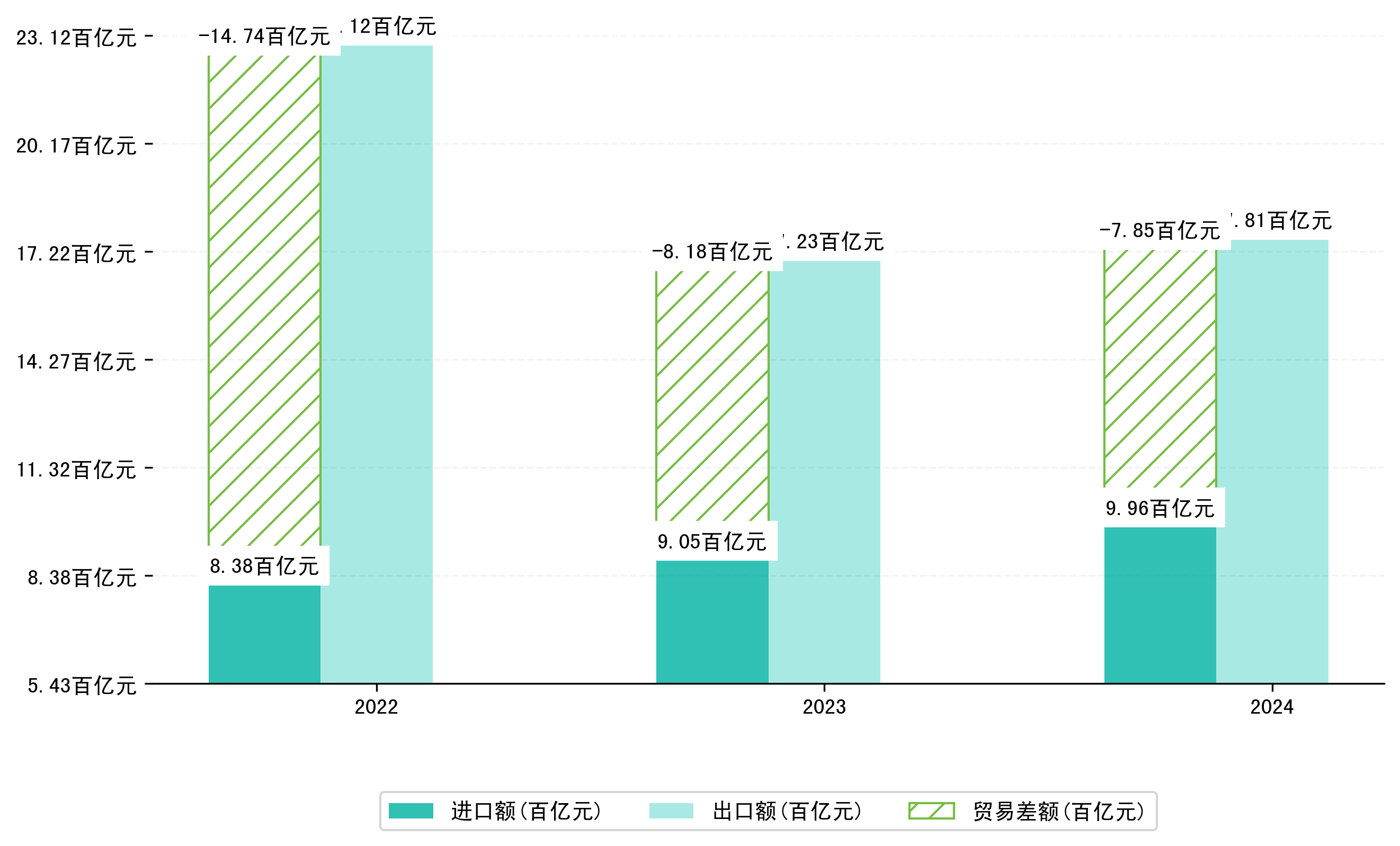 以人民币计,2024年1-12月长沙市贸易差额为785,2062,5762万元(贸易顺差),相比上年同期减少了33,2807,6316万元,同比减少-4.07%。