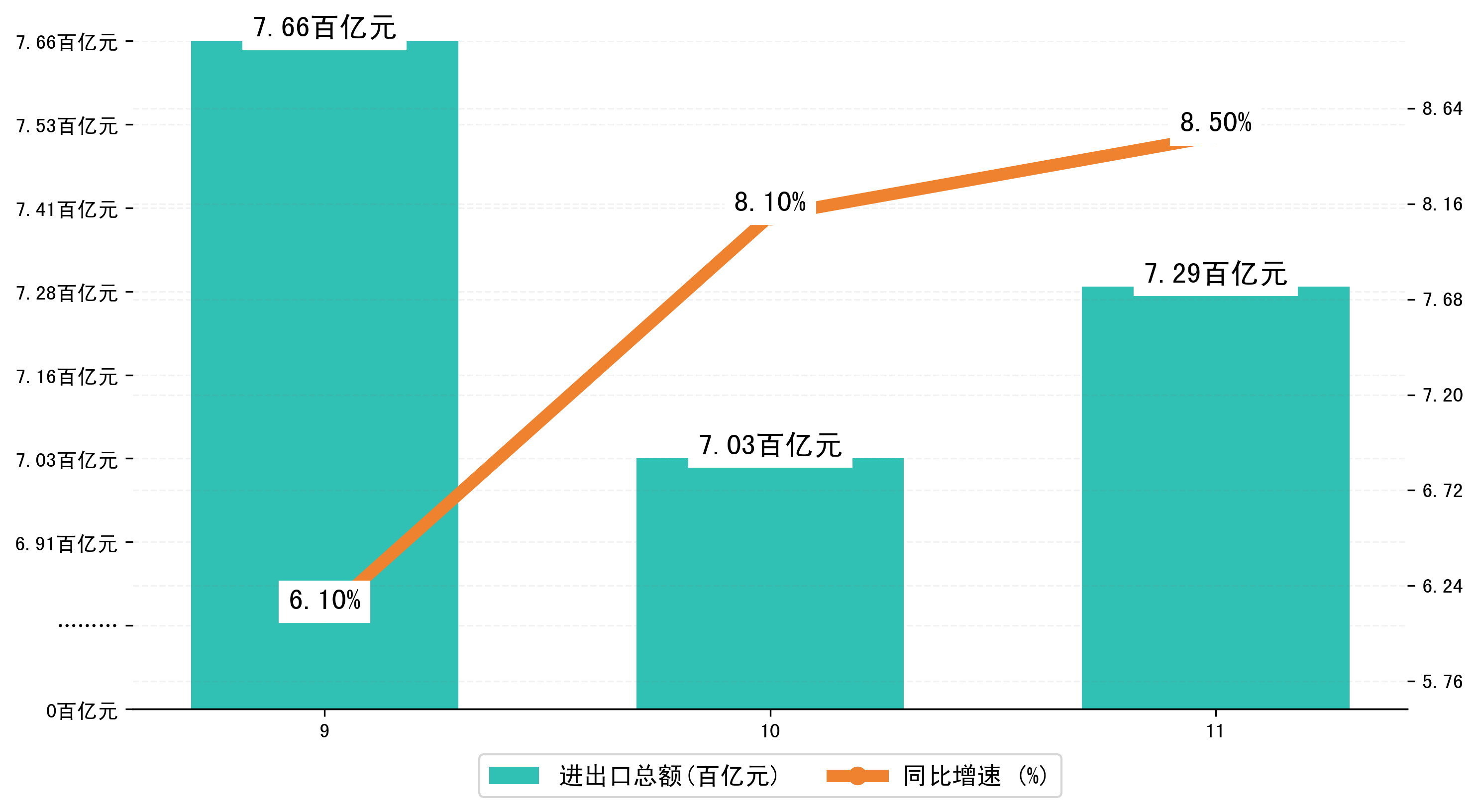 以人民币计,2023年11月安徽省进出口总额为728,9989.8597万元,相比上月增加了25,8538.1611万元;相比上年同期增加了73,0700.5339万元,同比增加了8.50%。