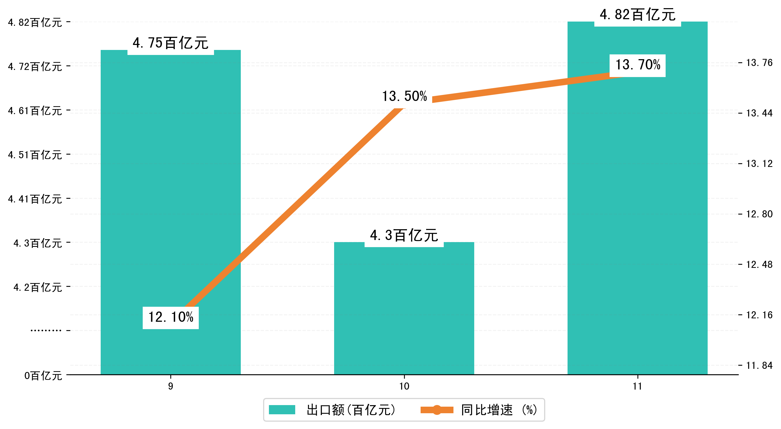 以美元计,2023年11月安徽省出口额为67,2116.5024万美元,相比上月增加了7,3520.0374万美元;相比上年同期增加了6,9167.4094万美元,同比增加7.30%。