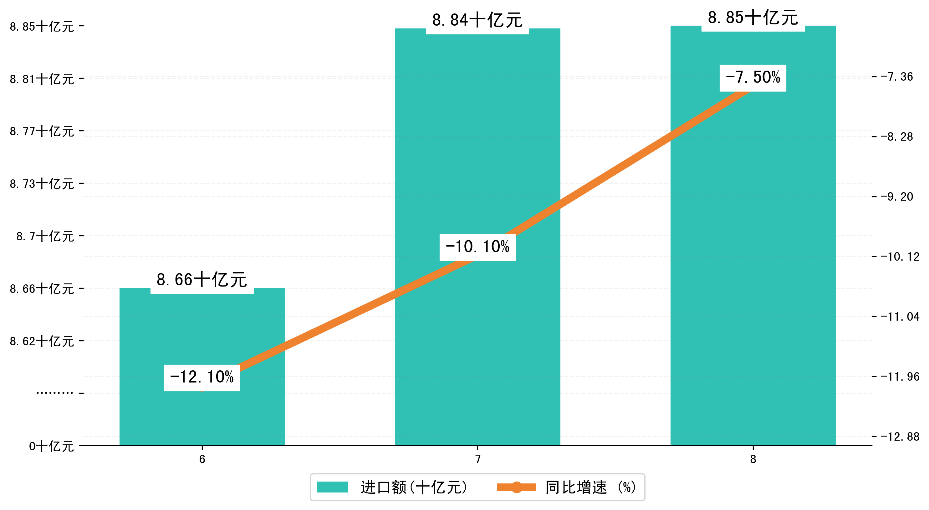 以美元计,2025年1-8月长沙市进口额为86,8662.6174万美元,相比上年同期减少了8,0656.0802万美元,同比减少-8.40%。