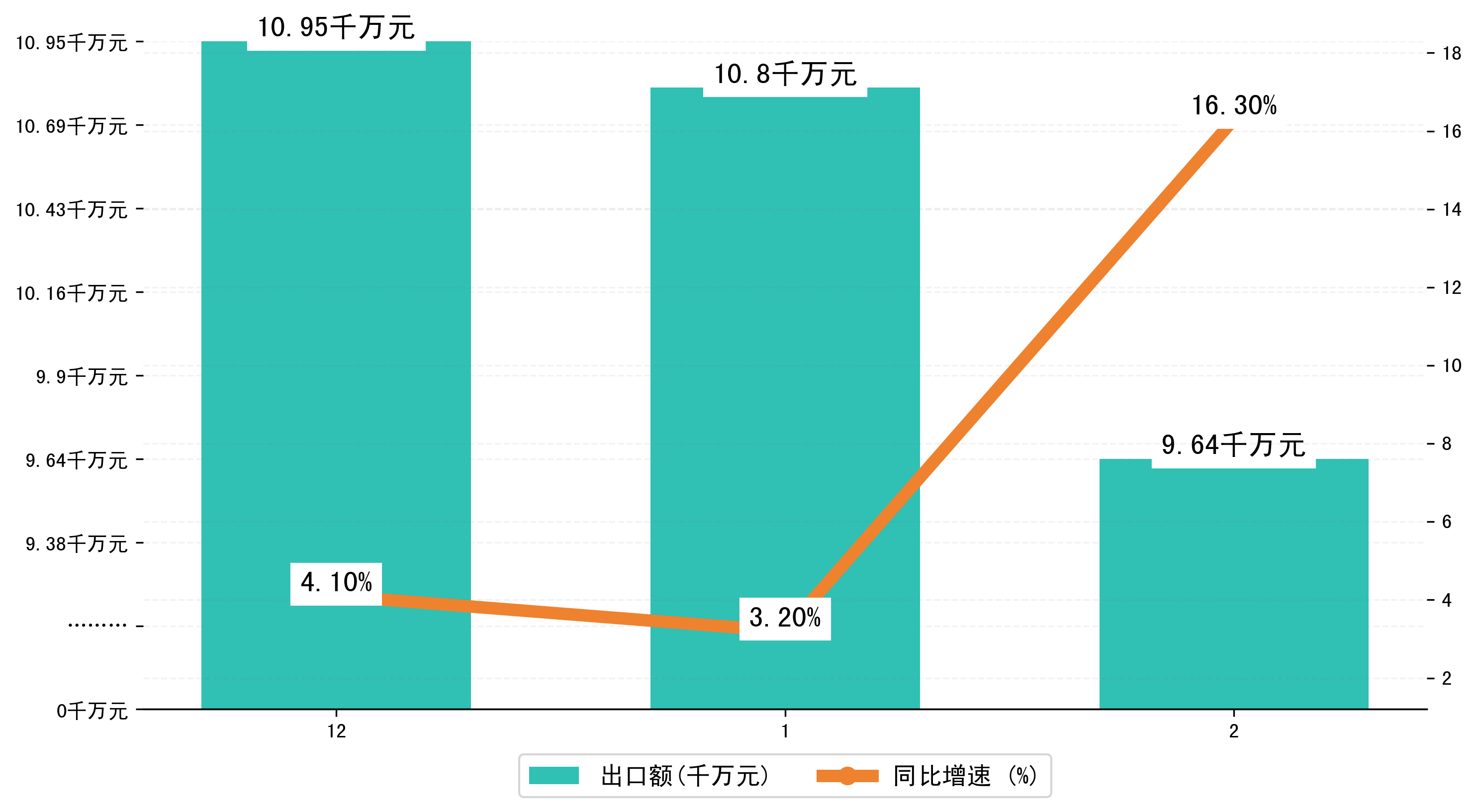 以人民币计,2023年1-2月长治市出口额为2,0444.5096万元,相比上年同期增加了2867.1204万元,同比增加了16.30%。