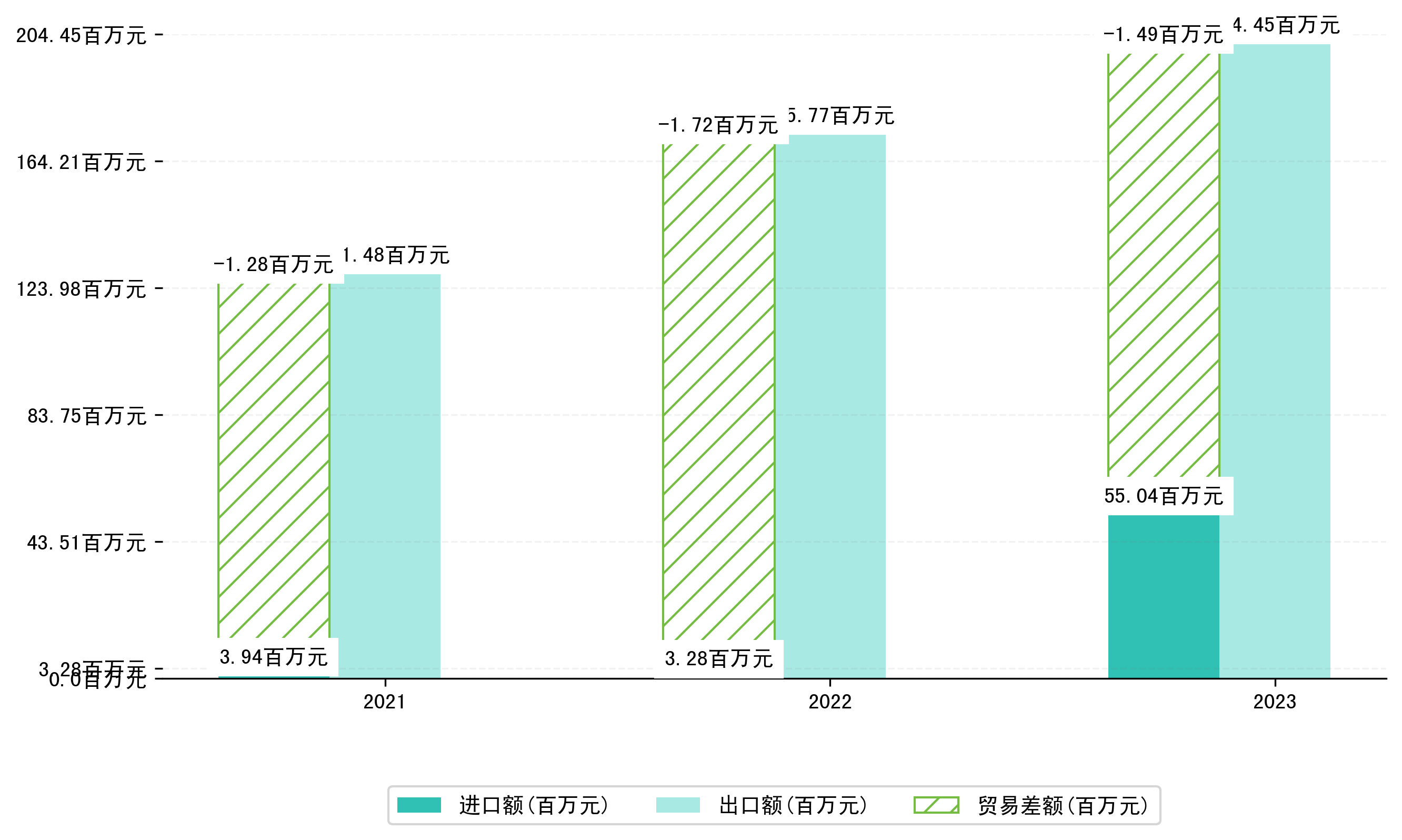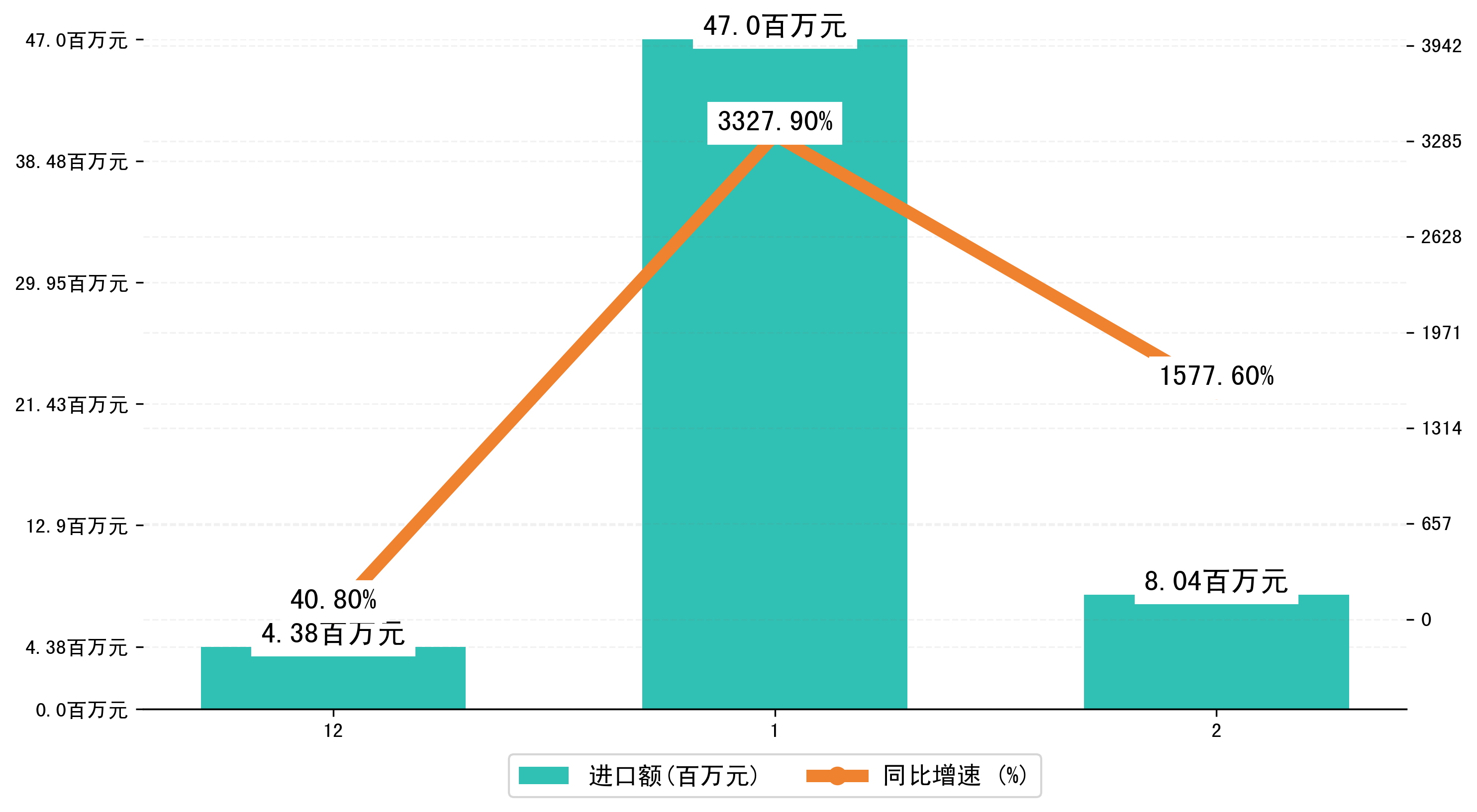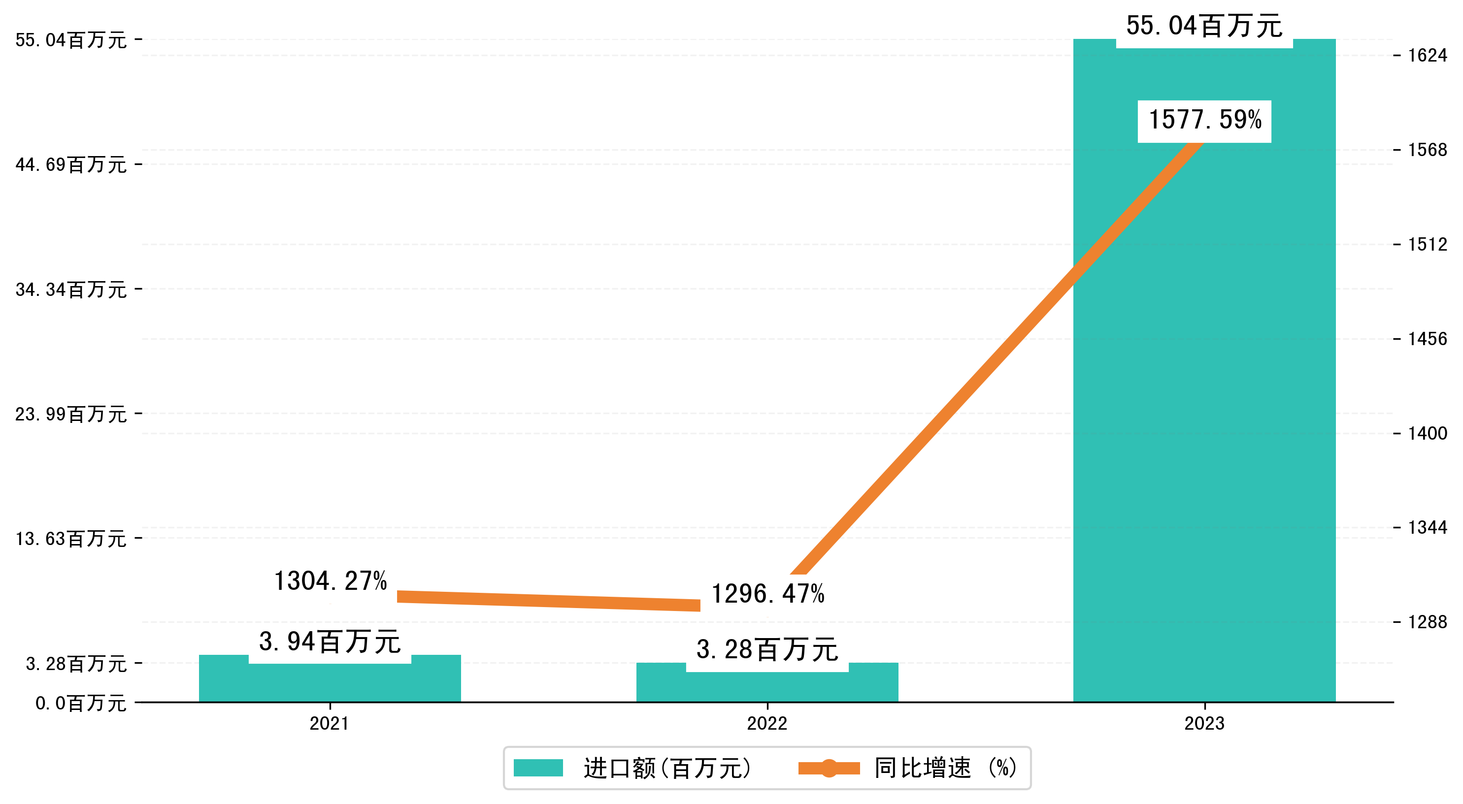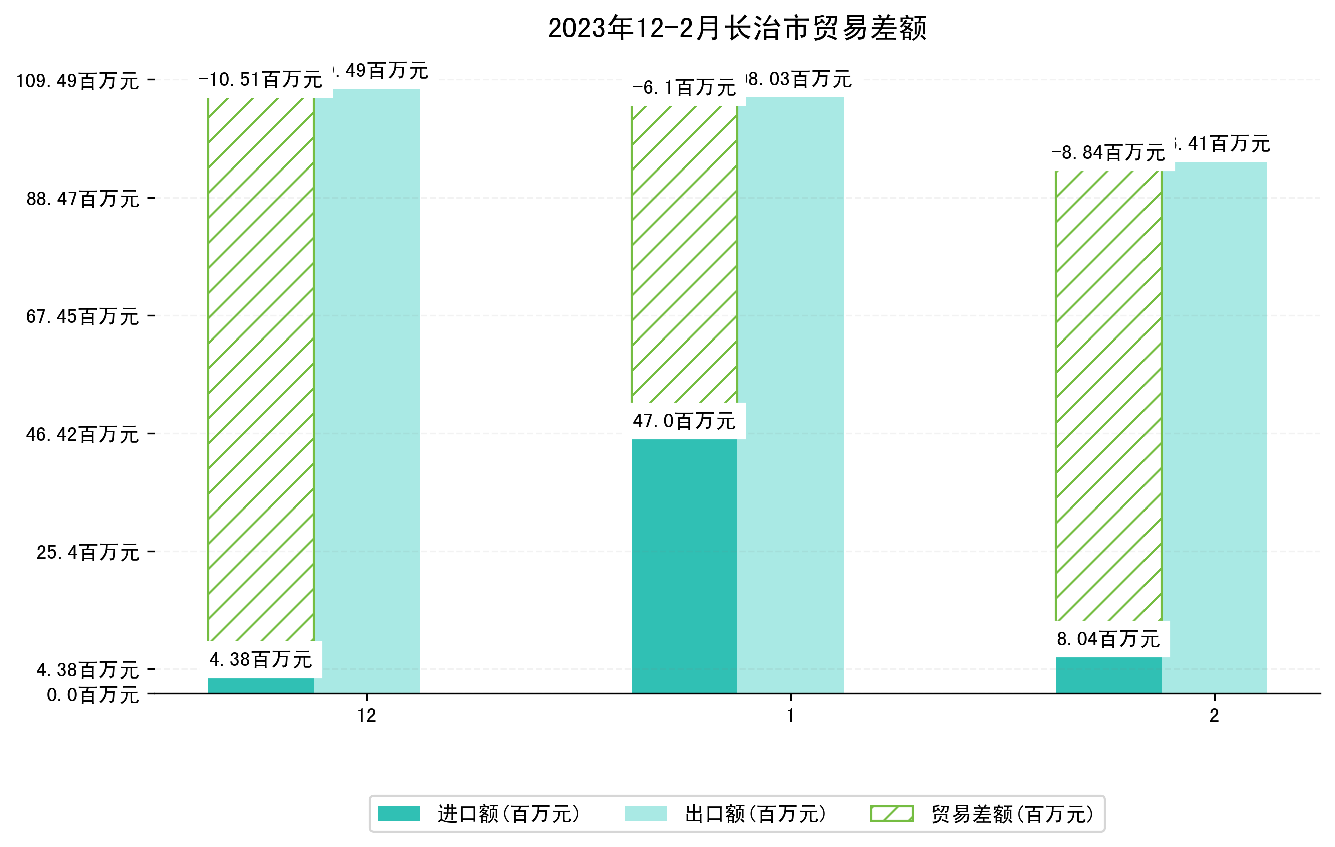 以美元计,2023年1-2月长治市进口额为787.0526万美元,相比上年同期增加了735.696万美元,同比增加1432.50%。