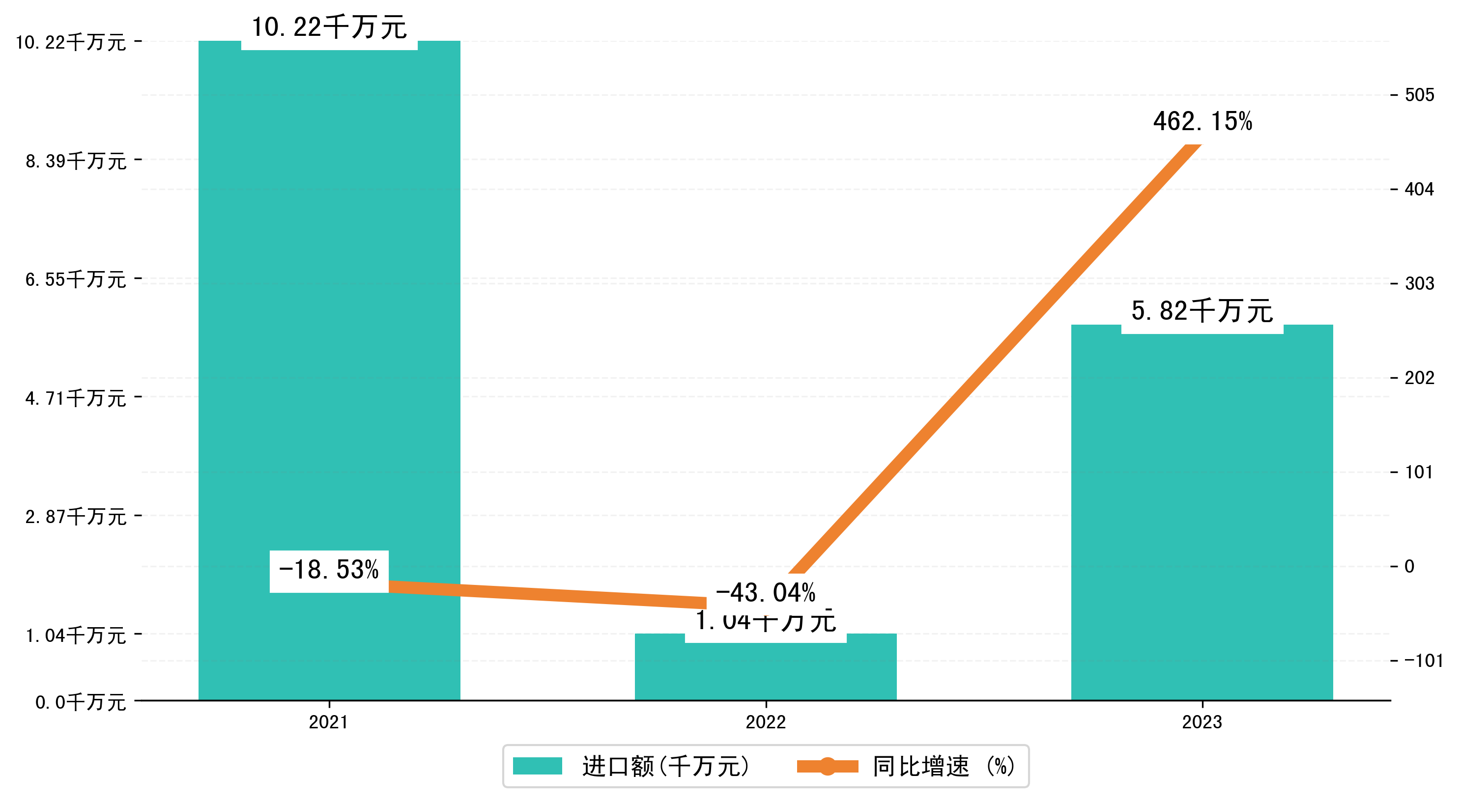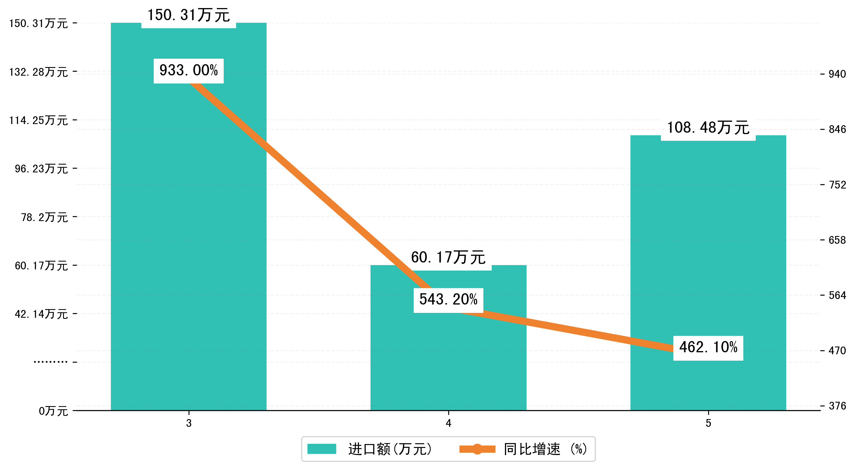 以人民币计,2023年5月长治市进口额为108.4831万元,相比上月增加了48.3174万元;相比上年同期减少了38.8759万元,同比增加了462.10%。