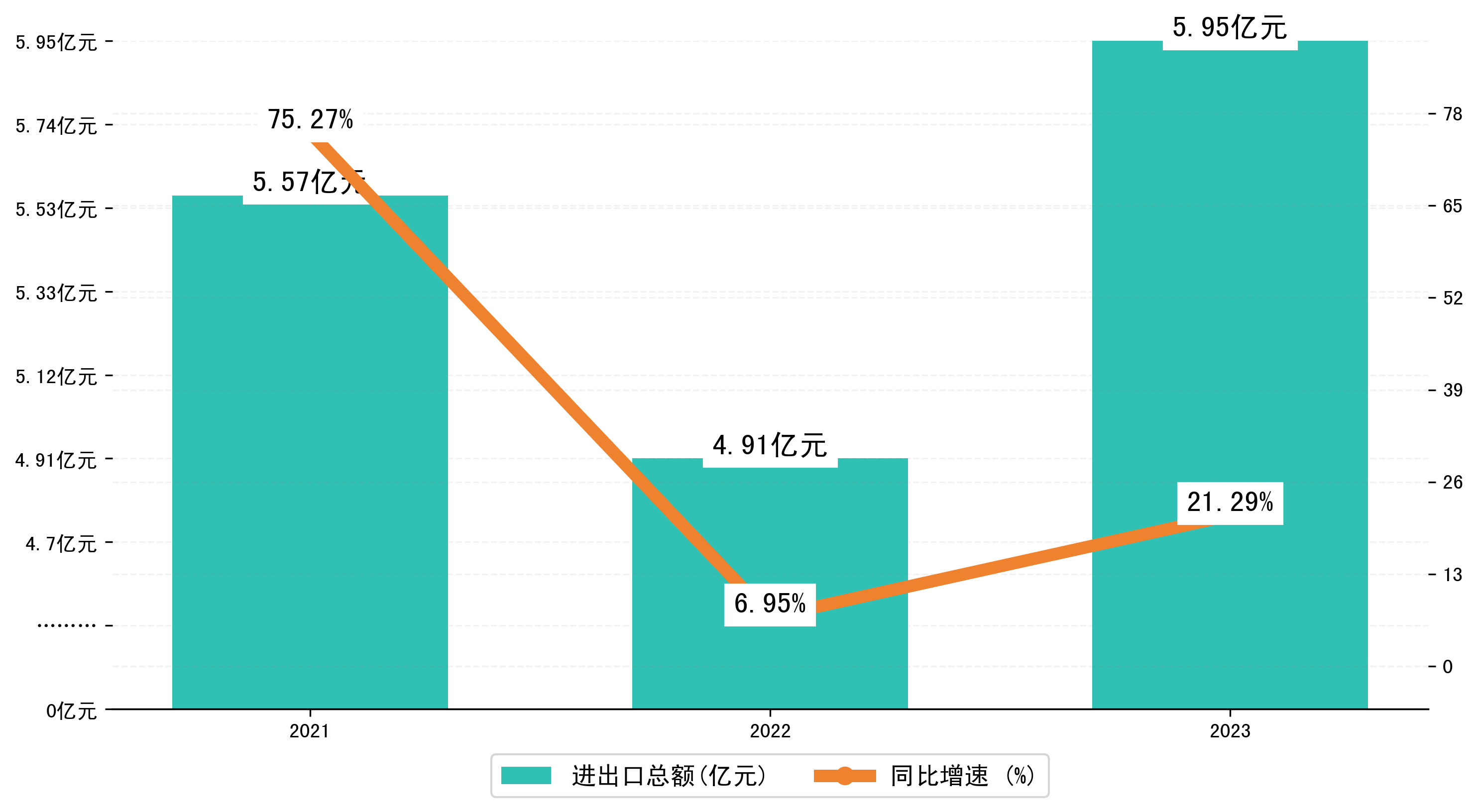 以人民币计,2023年1-5月长治市进出口总额为5,9524.7735万元,相比上年同期增加了1,0447.1291万元,同比增加了22.00%。