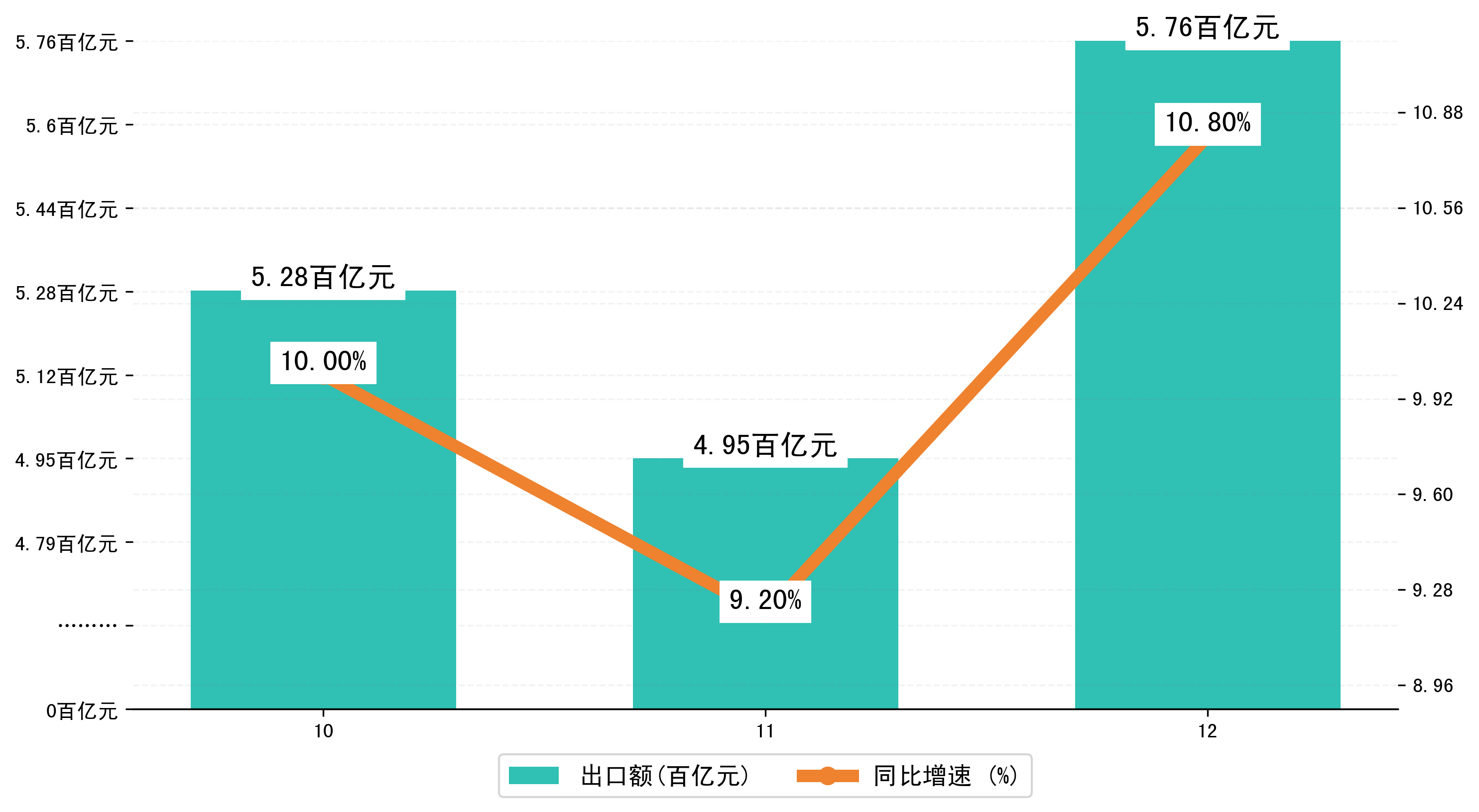 以人民币计,2024年12月安徽省出口额为576,0089.6259万元,相比上月增加了80,5947.8836万元;相比上年同期增加了126,0695.6477万元,同比增加了10.80%。