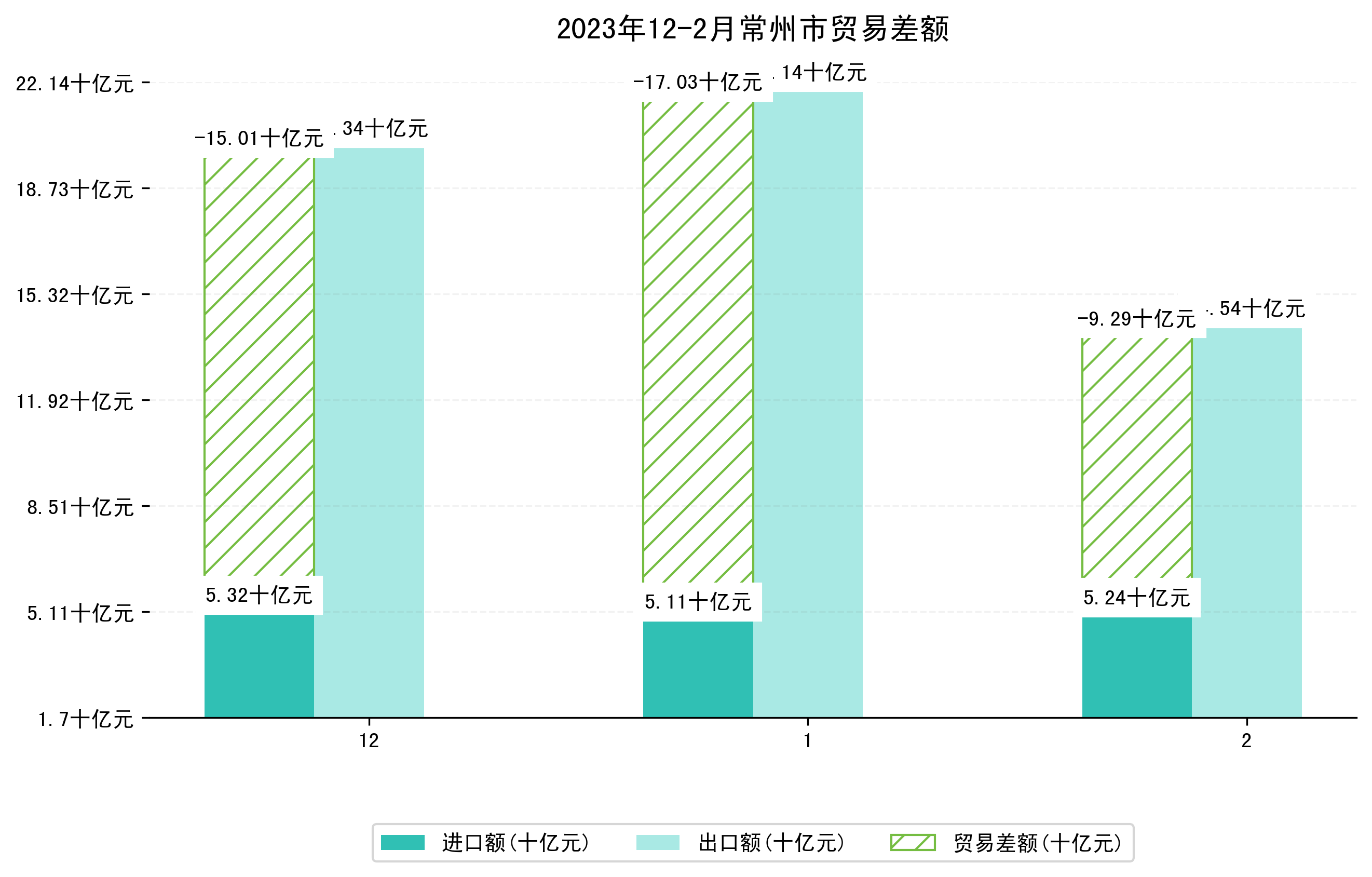 以人民币计,2023年2月常州市贸易差额为92,9393,8716万元(贸易顺差),相比上月减少了77,3477,5464万元,即10,6850,8961万美元;相比上年同期减少了12,3239,1971万元,同比减少-11.71%。