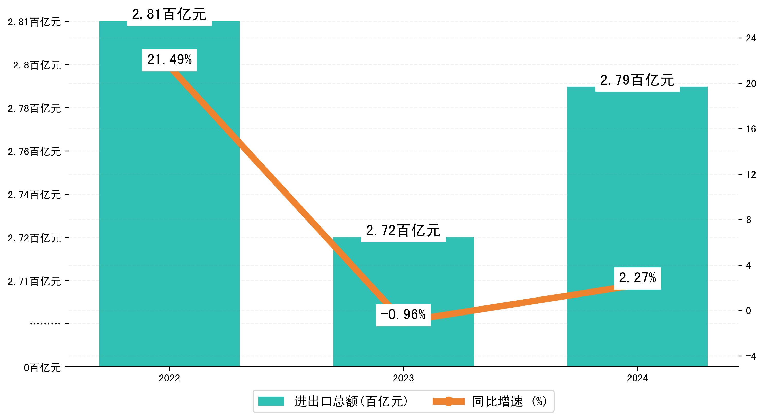 以人民币计,2024年1月常州市进出口总额为278,5970.526万元,相比上月增加了12,5148.6063万元;相比上年同期增加了6,1741.9877万元,同比增加了2.10%。