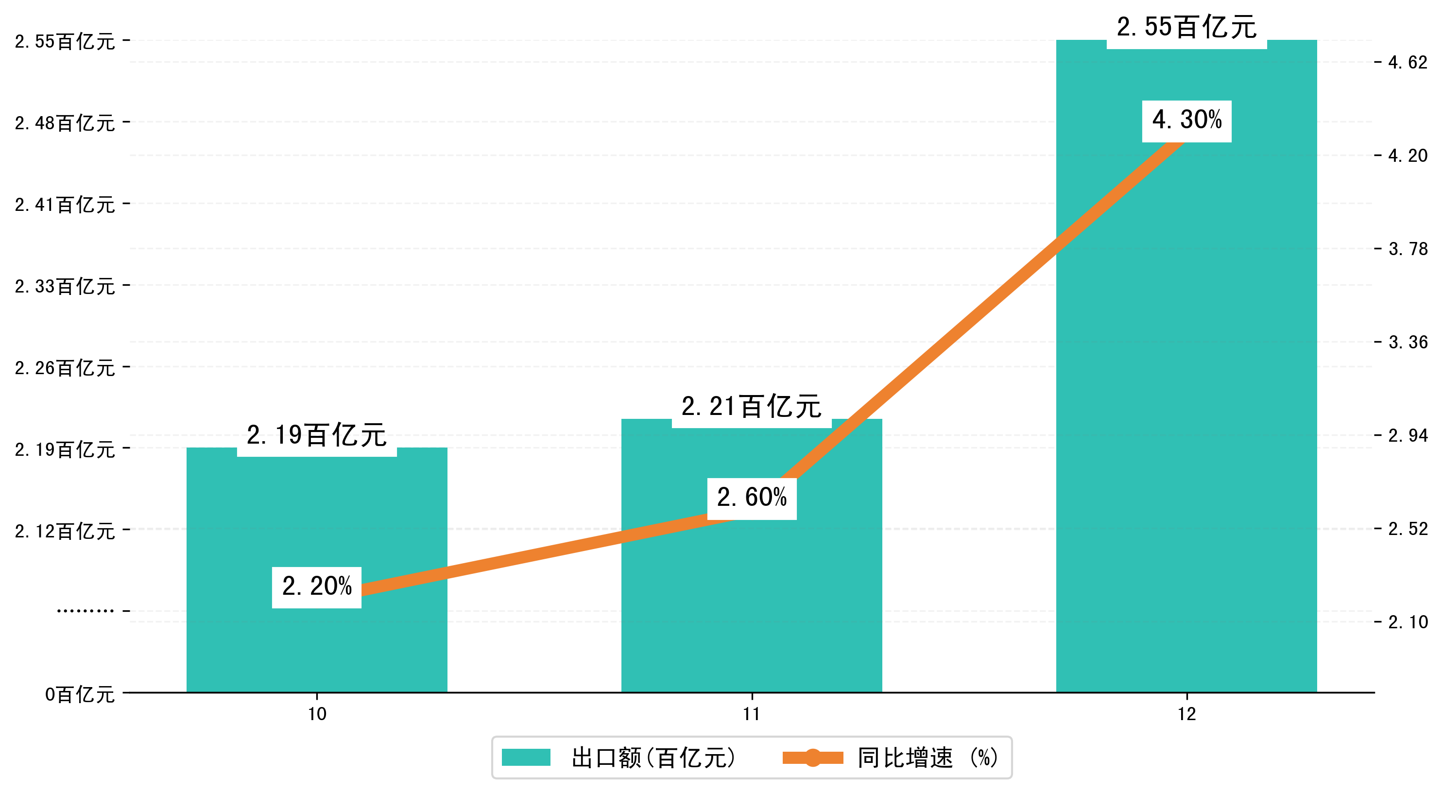 以人民币计,2024年12月常州市出口额为255,3060.4512万元,相比上月增加了33,8908.4588万元;相比上年同期增加了46,6880.3297万元,同比增加了4.30%。