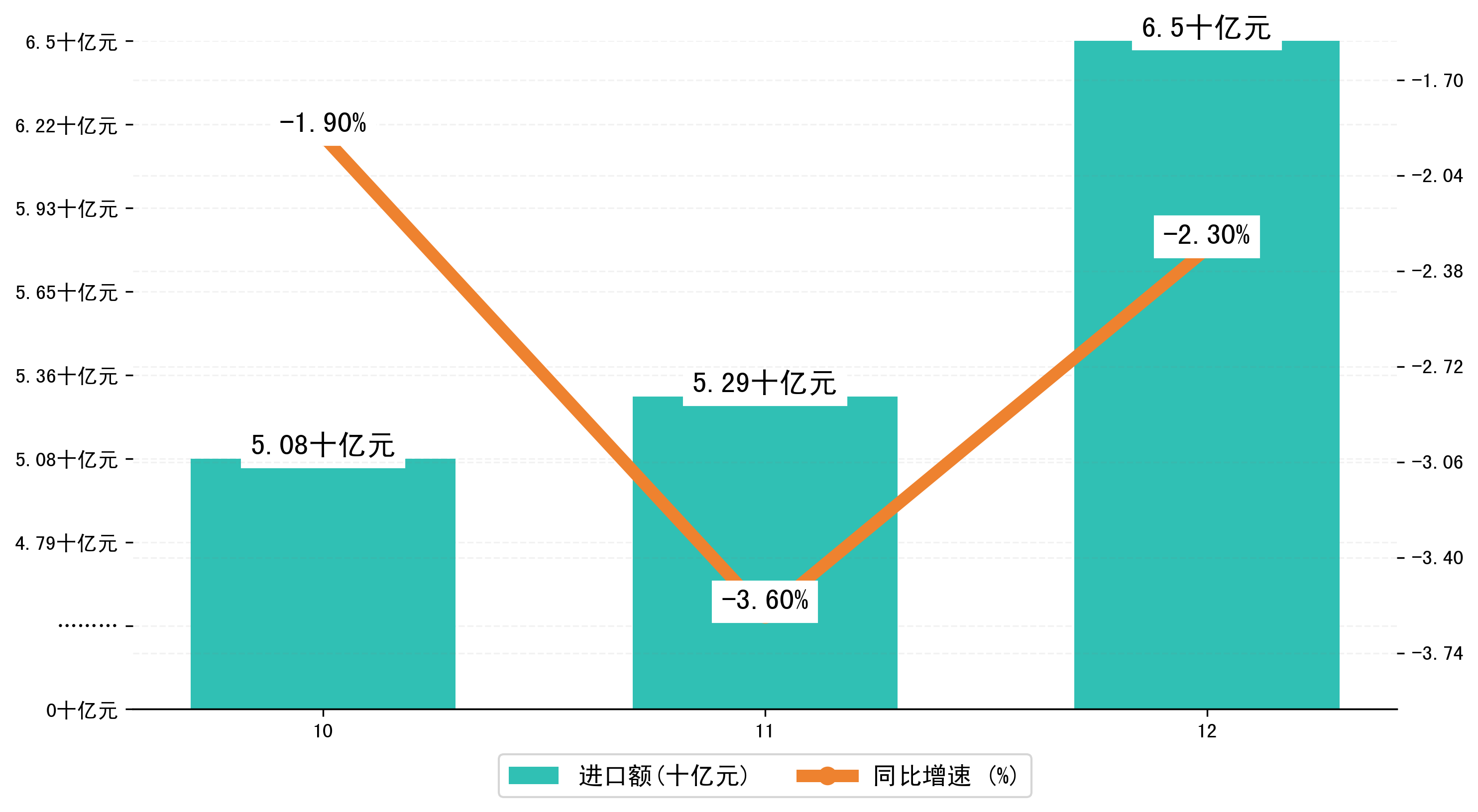 以人民币计,2024年12月常州市进口额为65,0139.9309万元,相比上月增加了12,1238.5402万元;相比上年同期增加了7,5498.1326万元,同比减少了-2.30%。