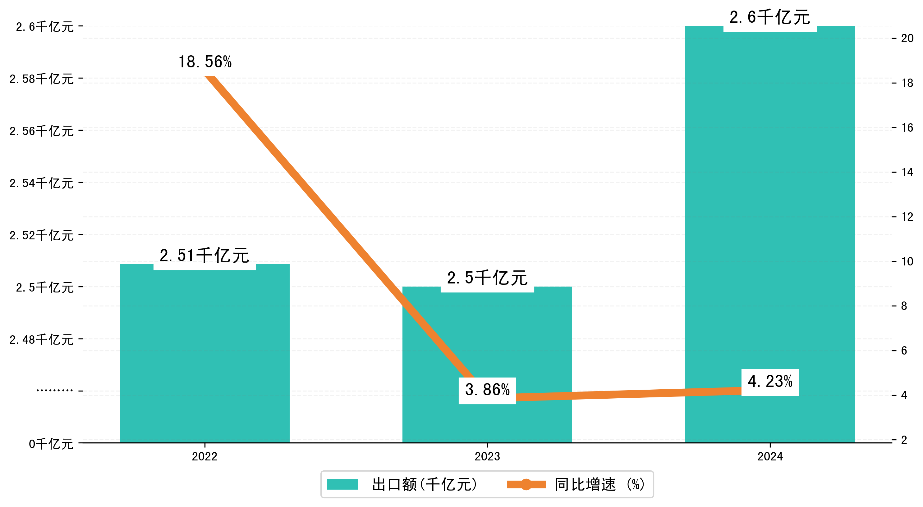 以人民币计,2024年1-12月常州市出口额为2604,1309.8492万元,相比上年同期增加了105,7780.454万元,同比增加了4.30%。