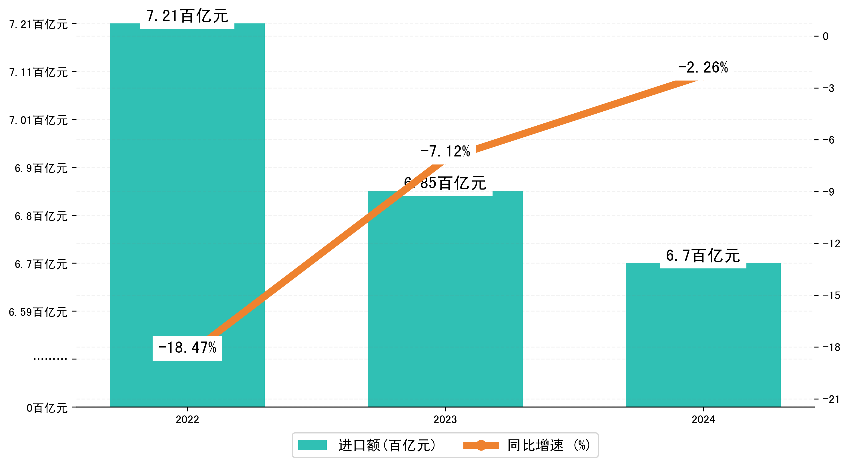 以人民币计,2024年1-12月常州市进口额为669,7638.7109万元,相比上年同期减少了15,5095.4871万元,同比减少了-2.30%。