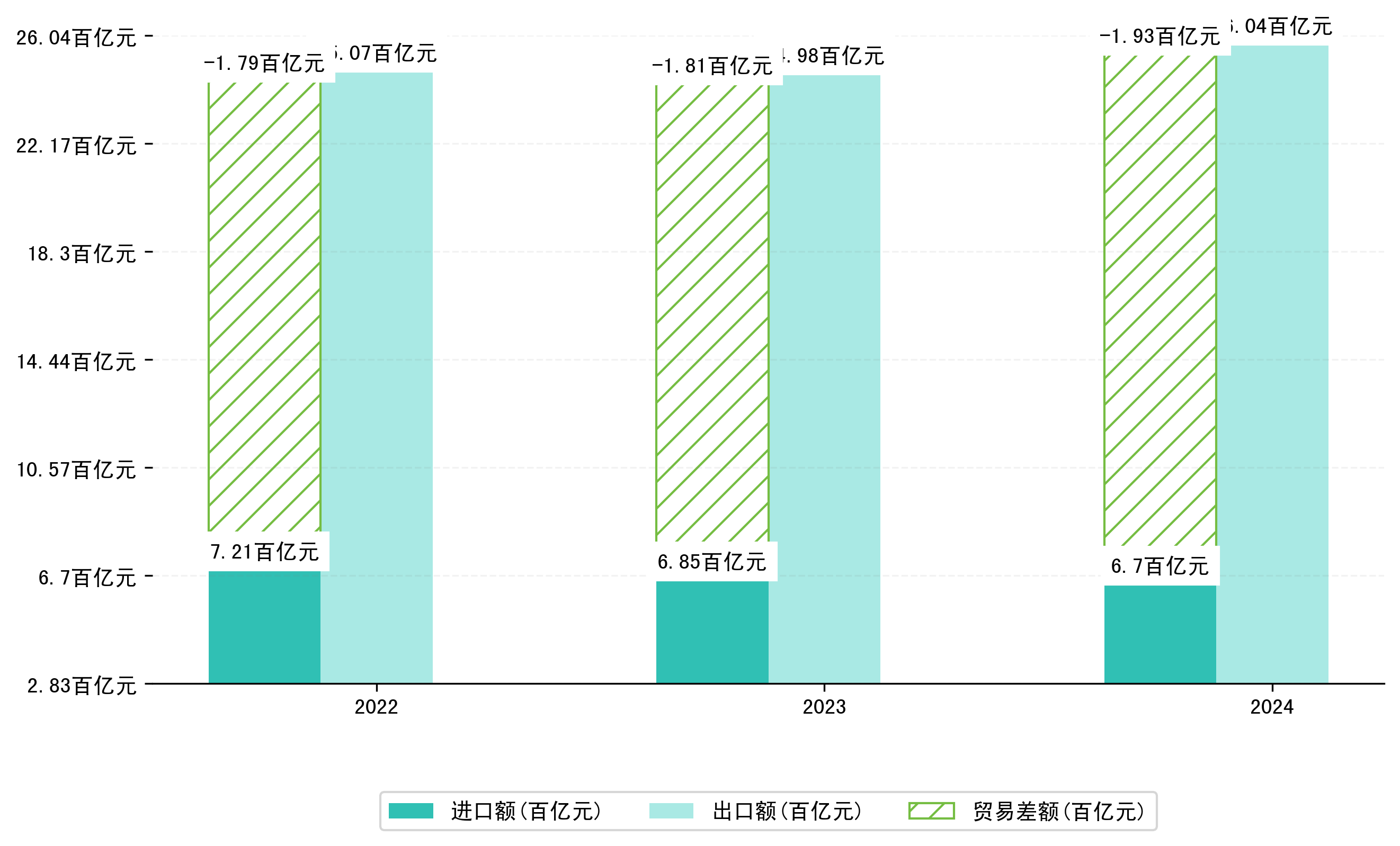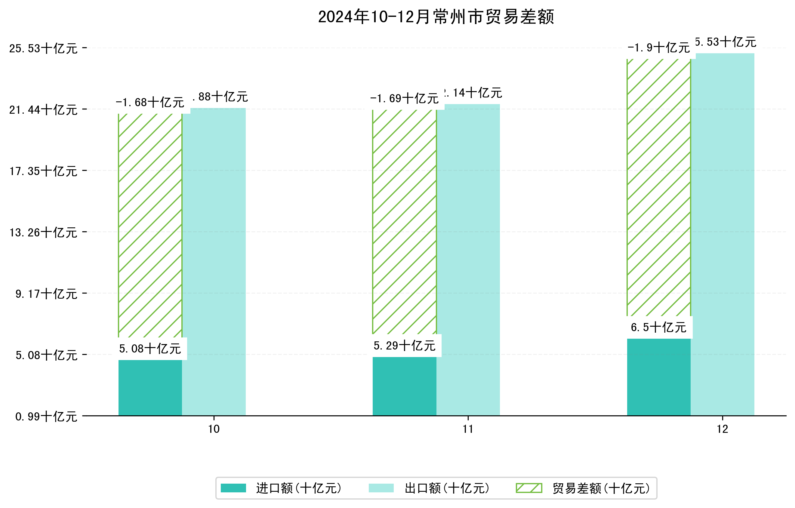 以美元计,2024年12月常州市贸易差额为26,4933,5889万美元(贸易顺差),相比上月增加了2,7911,7181万美元;相比上年同期增加了5,4020,2343万美元,同比增加25.61%。